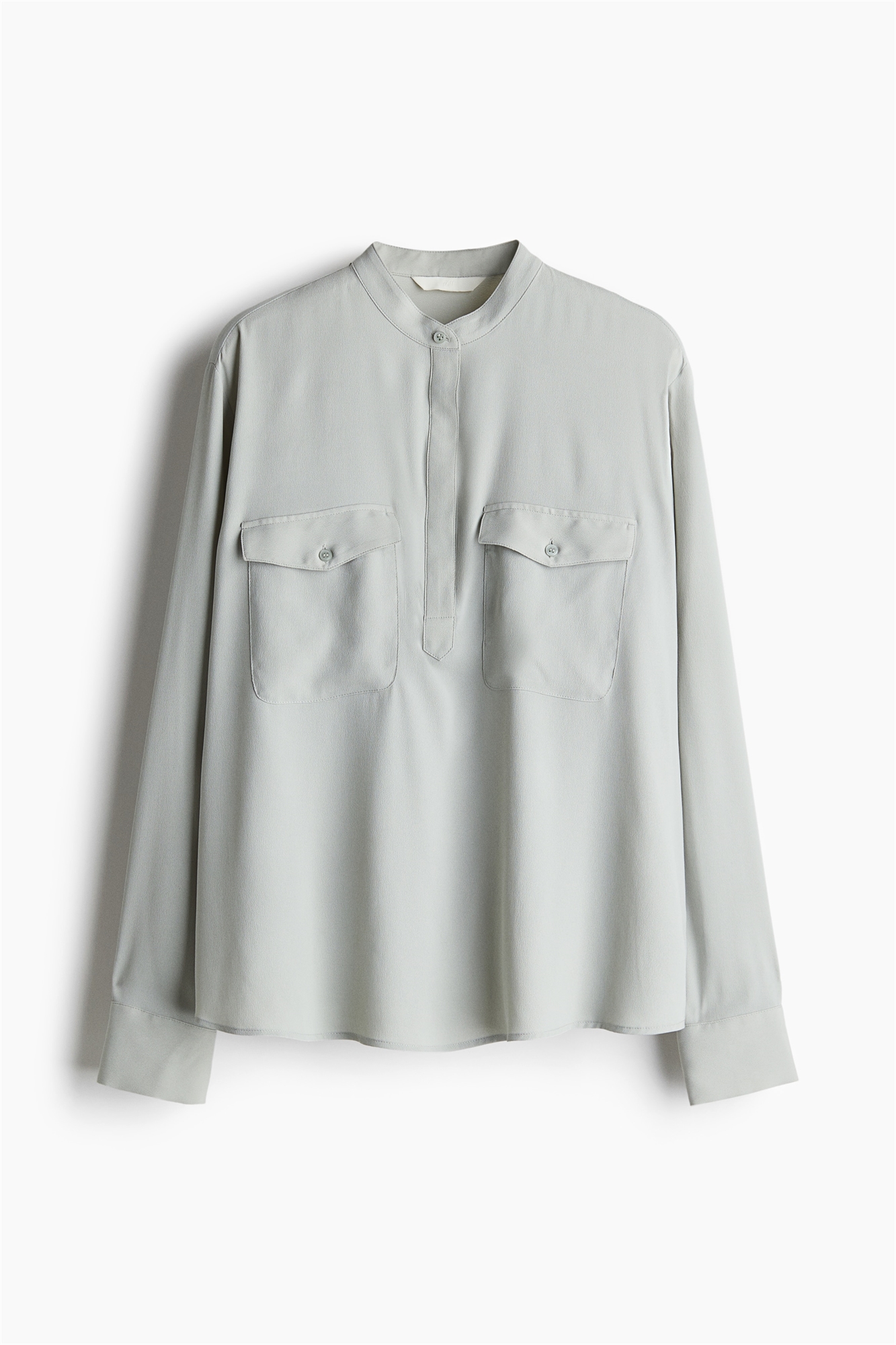 Свободная блузка из крепа с воротником-стойкой и потайными пуговицами в верхней части. Нагрудные карманы с клапаном и пуговицей и двухслойная спинка с боковыми складками. Слегка спущенные плечи и длинные рукава с манжетами на пуговицах.