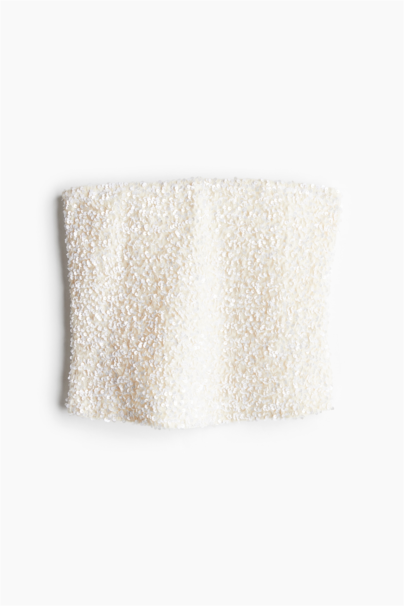 Короткий топ-бандо из велюра с блестками, потайная застежка-молния с одной стороны и силиконовая окантовка в верхней части для фиксации. Подкладка из джерси.