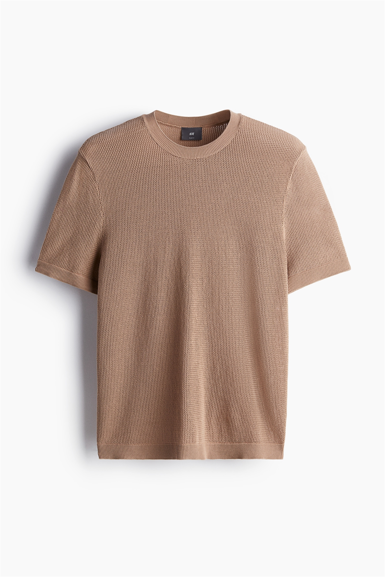 Футболка структурного плетения с круглым ребристым вырезом и прямым подолом. Зауженный крой, облегающий контуры тела и создающий приталенный силуэт.
