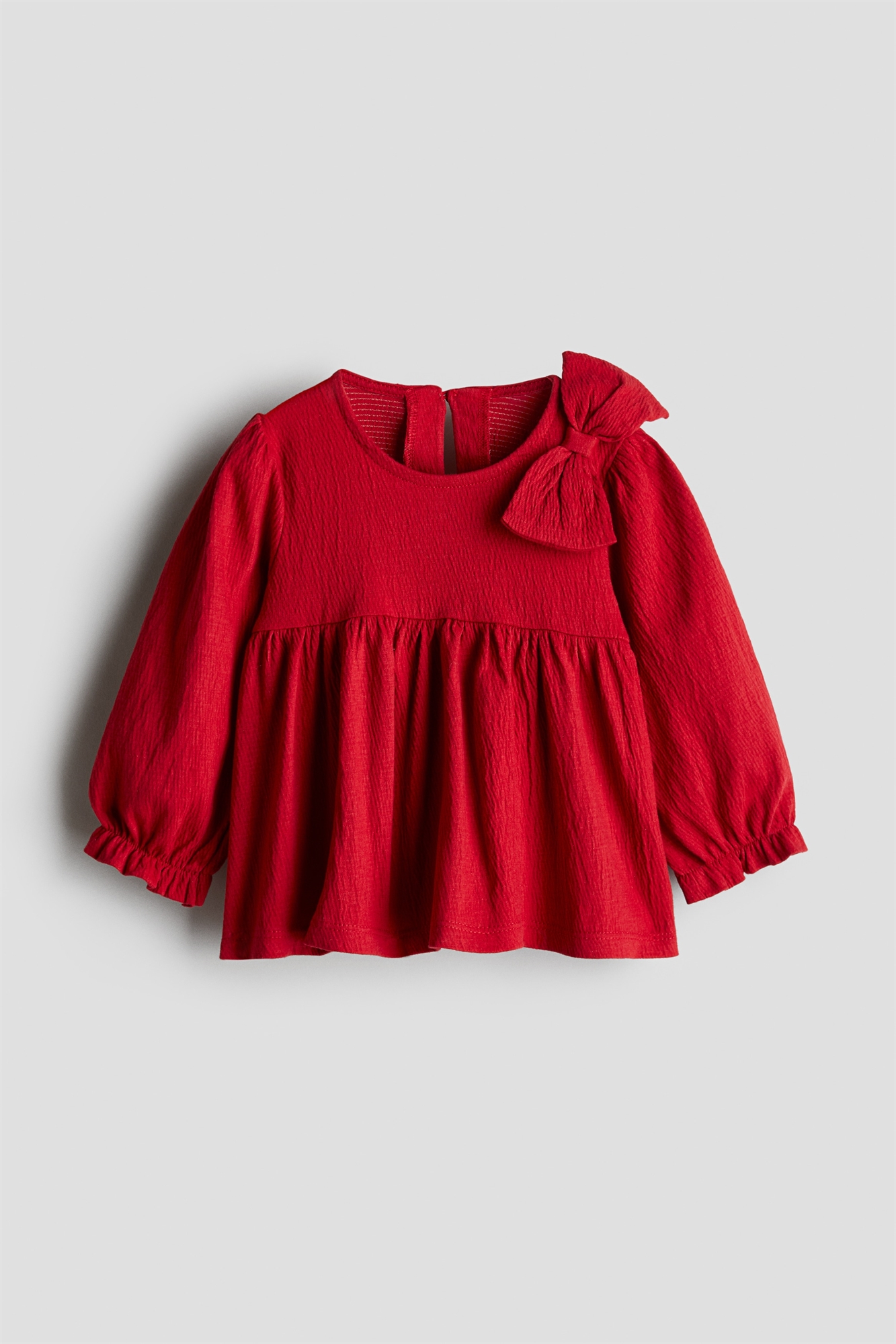 Расклешенная блузка из мятого хлопкового джерси с большим декоративным бантом на одном плече. Круглый вырез, отверстие для ключа с пуговицей на затылке и сборка на ярме. Длинные пышные рукава с эластичным воланом.