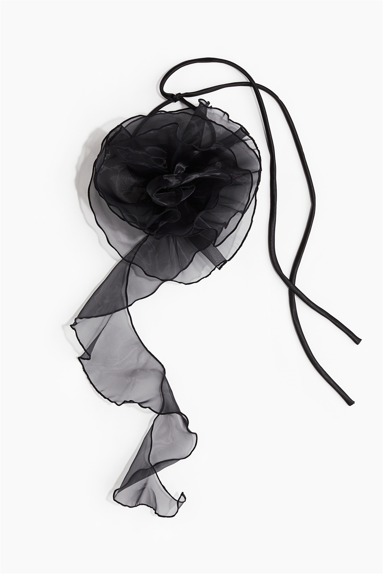 Ожерелье-шарф с объемной цветочной аппликацией из органзы с оверлочными краями и воланом спереди. Застежка-булавка сзади.