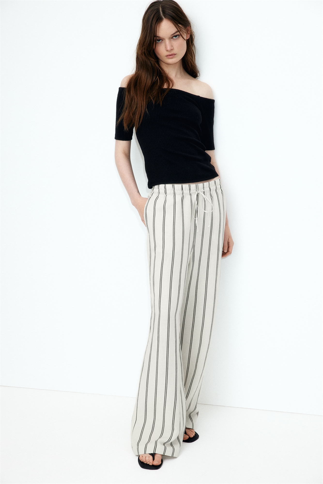 Свободные брюки с воздушным плетением из смеси льна. Высокая эластичная талия с узким шнурком, неброские боковые карманы и прямые ноги.