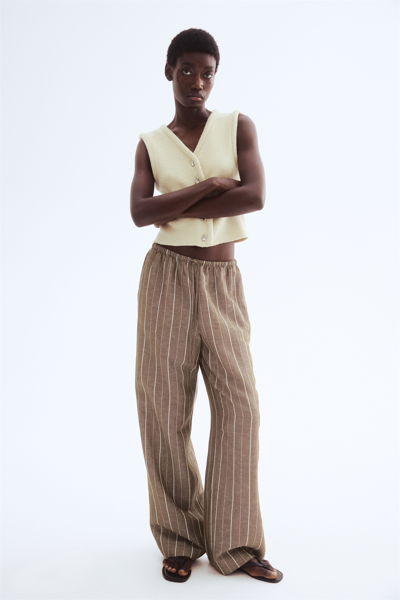 Брюки с воздушным плетением из смеси льна. Свободный крой с узкой, закрытой резинкой и утягивающим шнурком на талии. Небрежные боковые карманы, втачные задние карманы и прямые ноги.
