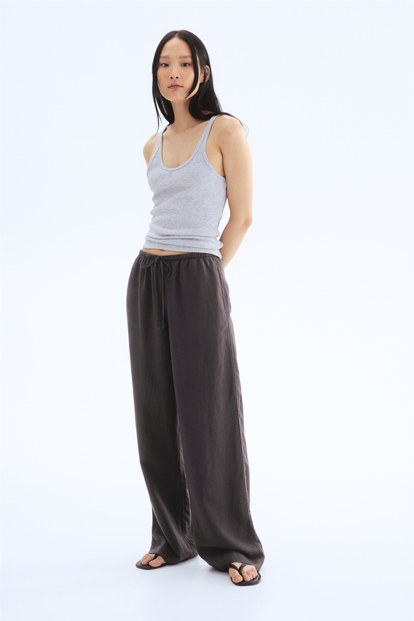Брюки с воздушным плетением из смеси льна. Свободный крой с узкой, закрытой резинкой и утягивающим шнурком на талии. Небрежные боковые карманы, втачные задние карманы и прямые ноги.