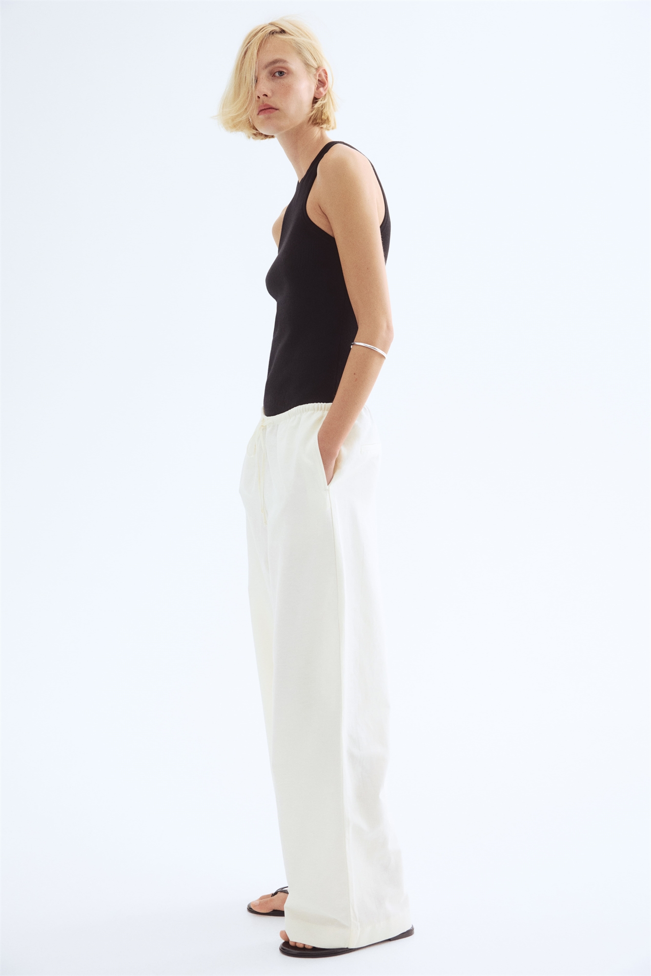 Брюки с воздушным плетением из смеси льна. Свободный крой с узкой, закрытой резинкой и утягивающим шнурком на талии. Небрежные боковые карманы, втачные задние карманы и прямые ноги.