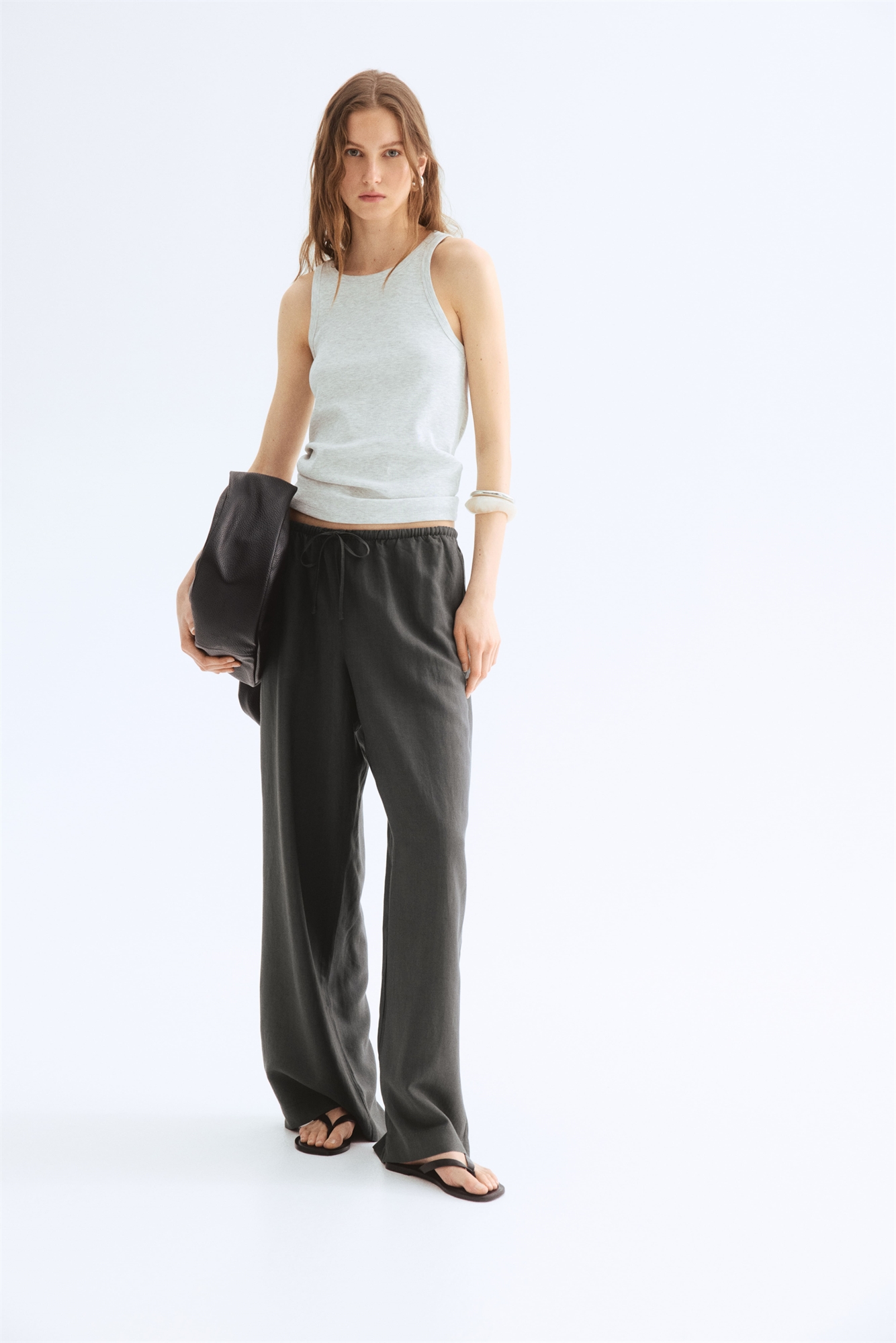 Брюки с воздушным плетением из смеси льна. Свободный крой с узкой, закрытой резинкой и утягивающим шнурком на талии. Небрежные боковые карманы, втачные задние карманы и прямые ноги.