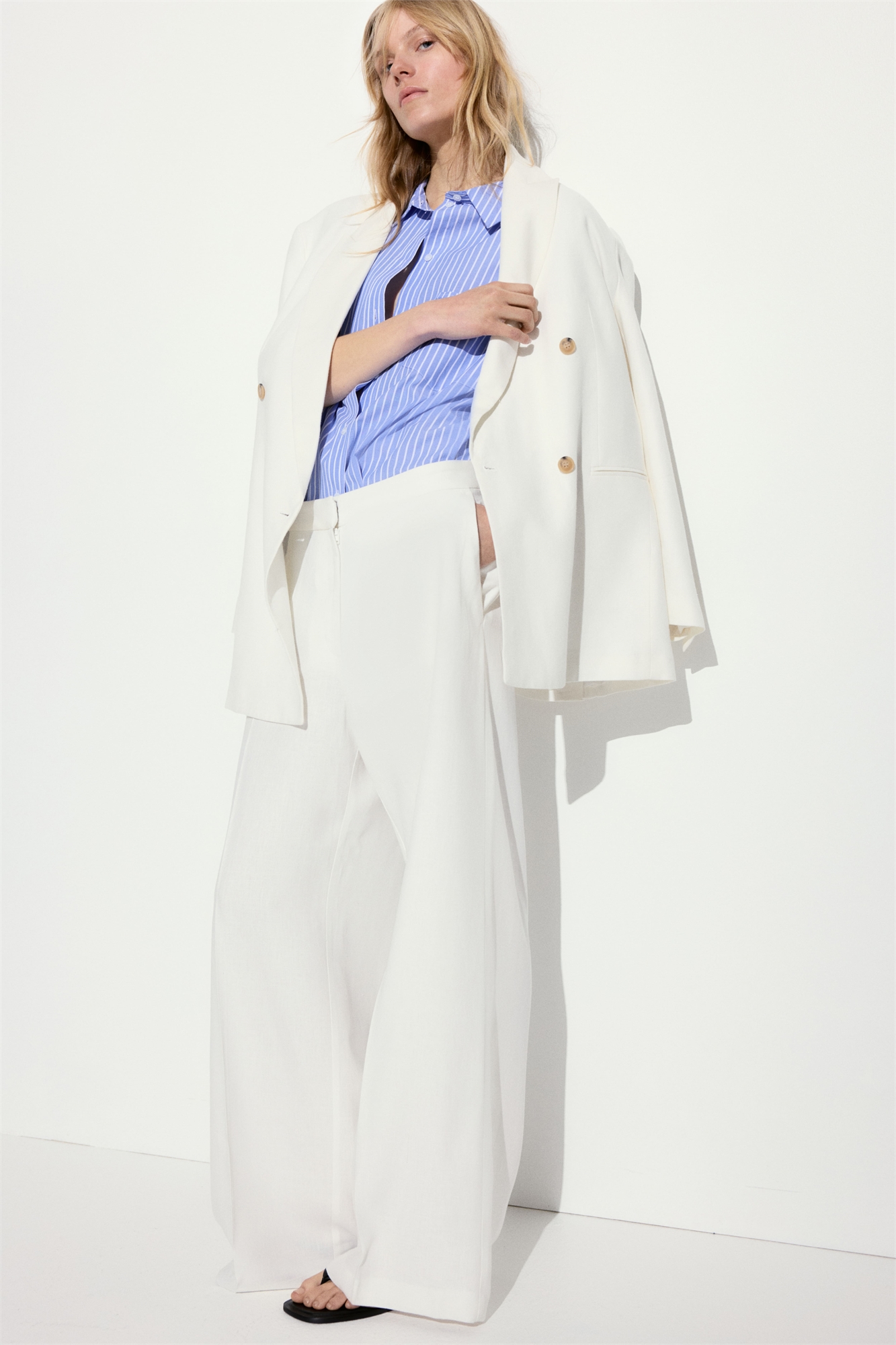 Приталенные брюки с воздушным плетением из смеси вискозы и льна. Высокая талия и ширинка на молнии с потайной застежкой на пуговицу и крючок. Диагональные боковые карманы, втачные карманы сзади и широкие штанины со складками спереди и сзади.