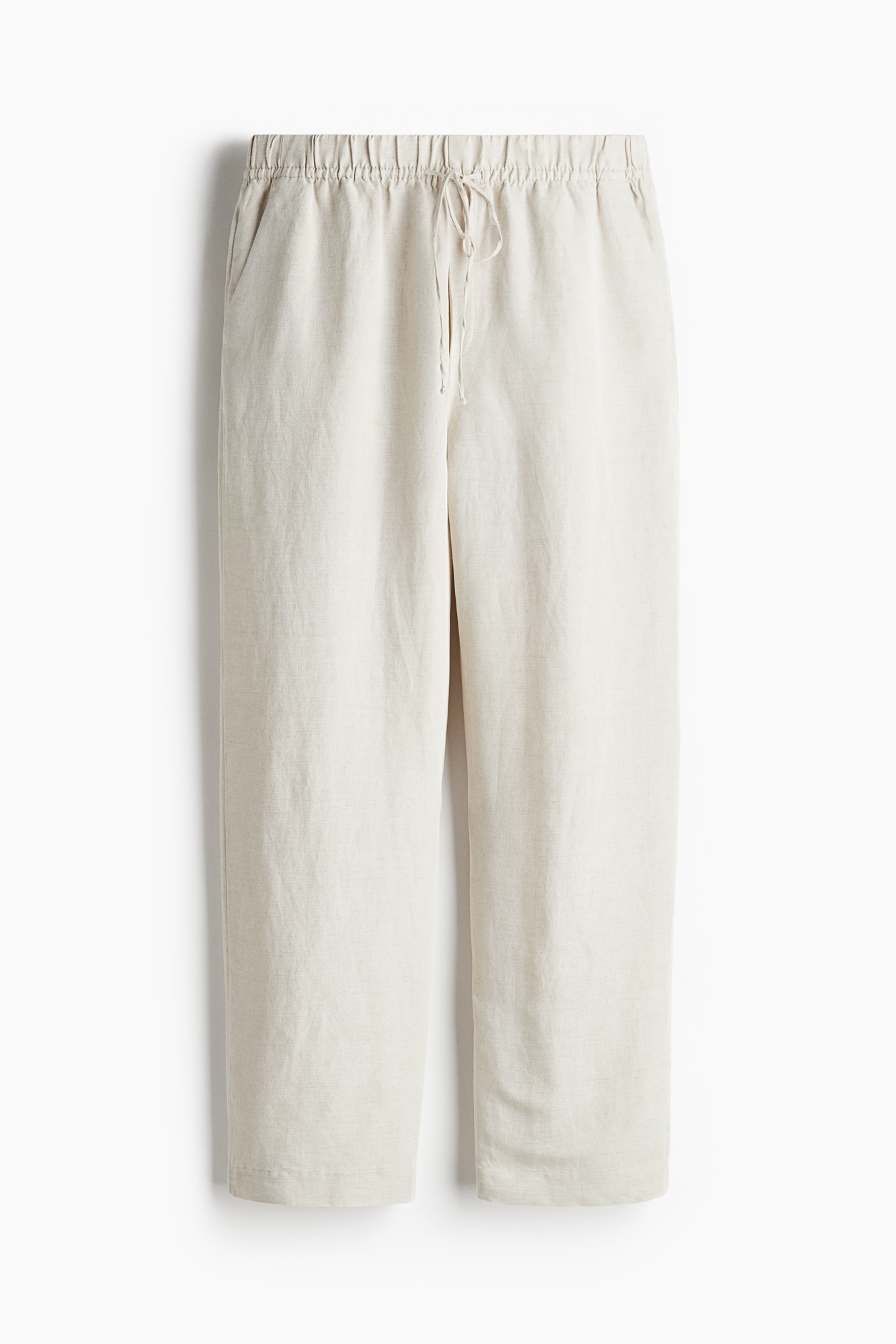 Брюки длиной до щиколотки из воздушной ткани из льняного микса. Высокий эластичный пояс с узким шнурком. Свободный крой, косые боковые карманы и зауженные штанины.