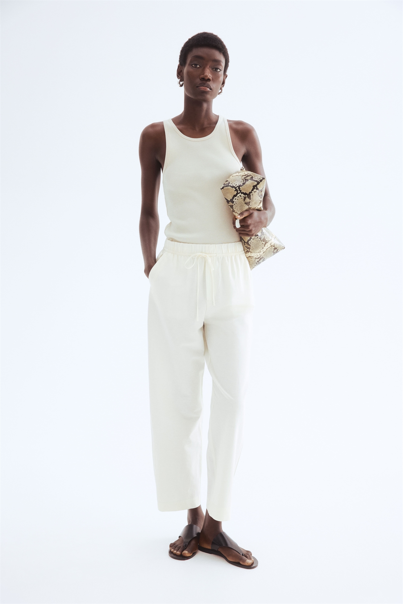 Брюки длиной до щиколотки из воздушной ткани из льняного микса. Высокий эластичный пояс с узким шнурком. Свободный крой, косые боковые карманы и зауженные штанины.