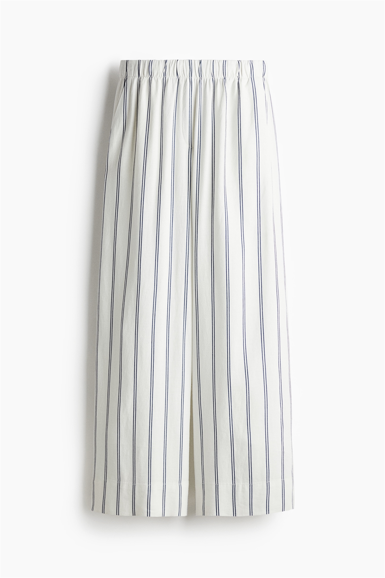 Брюки из воздушной ткани из льна и вискозы с высокой эластичной талией и фальшивой ширинкой. Свободный крой с диагональными боковыми карманами, фальшивыми карманами сзади и широкими штанинами.