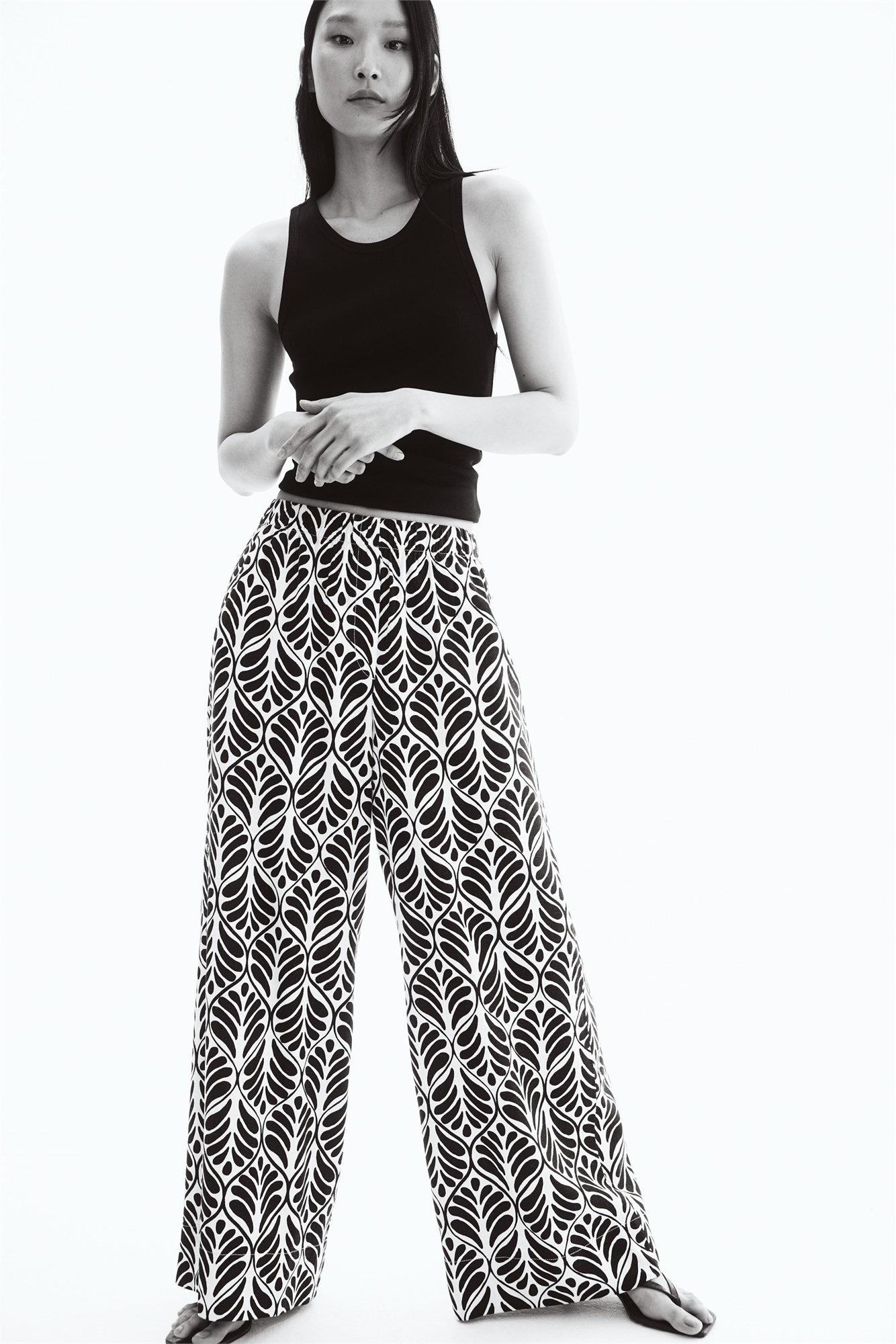 Брюки из воздушной ткани из льна и вискозы с высокой эластичной талией и фальшивой ширинкой. Свободный крой с диагональными боковыми карманами, фальшивыми карманами сзади и широкими штанинами.