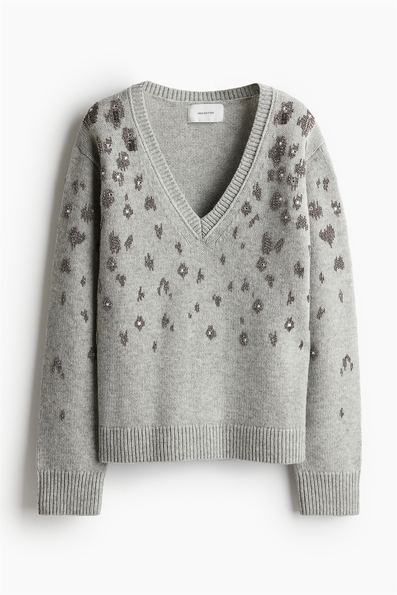 Джемпер из вязаной шерсти украшен мелкими стеклянными бусинами и бусинами-багром. Глубокий V-образный вырез, спущенные плечи и длинные рукава. Окантовка вокруг выреза, на манжетах и подоле.