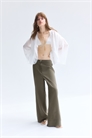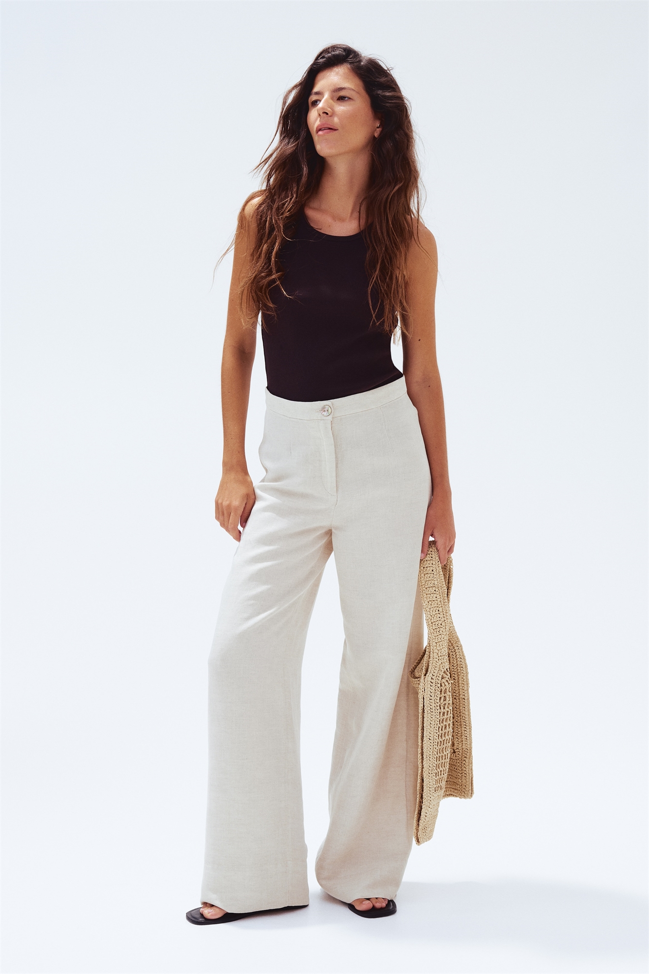 Приталенные брюки с воздушным плетением из смеси льна и вискозы. Высокая талия с вытачками спереди и сзади, застежка на молнию и перламутровую пуговицу, широкие штанины.