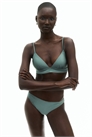 Бикини-треугольник на подкладке, без проводов, с мягкими чашечками для увеличения бюста и декольте. Узкие регулируемые бретели и широкий эластичный подол с регулируемой застежкой-крючком сзади.