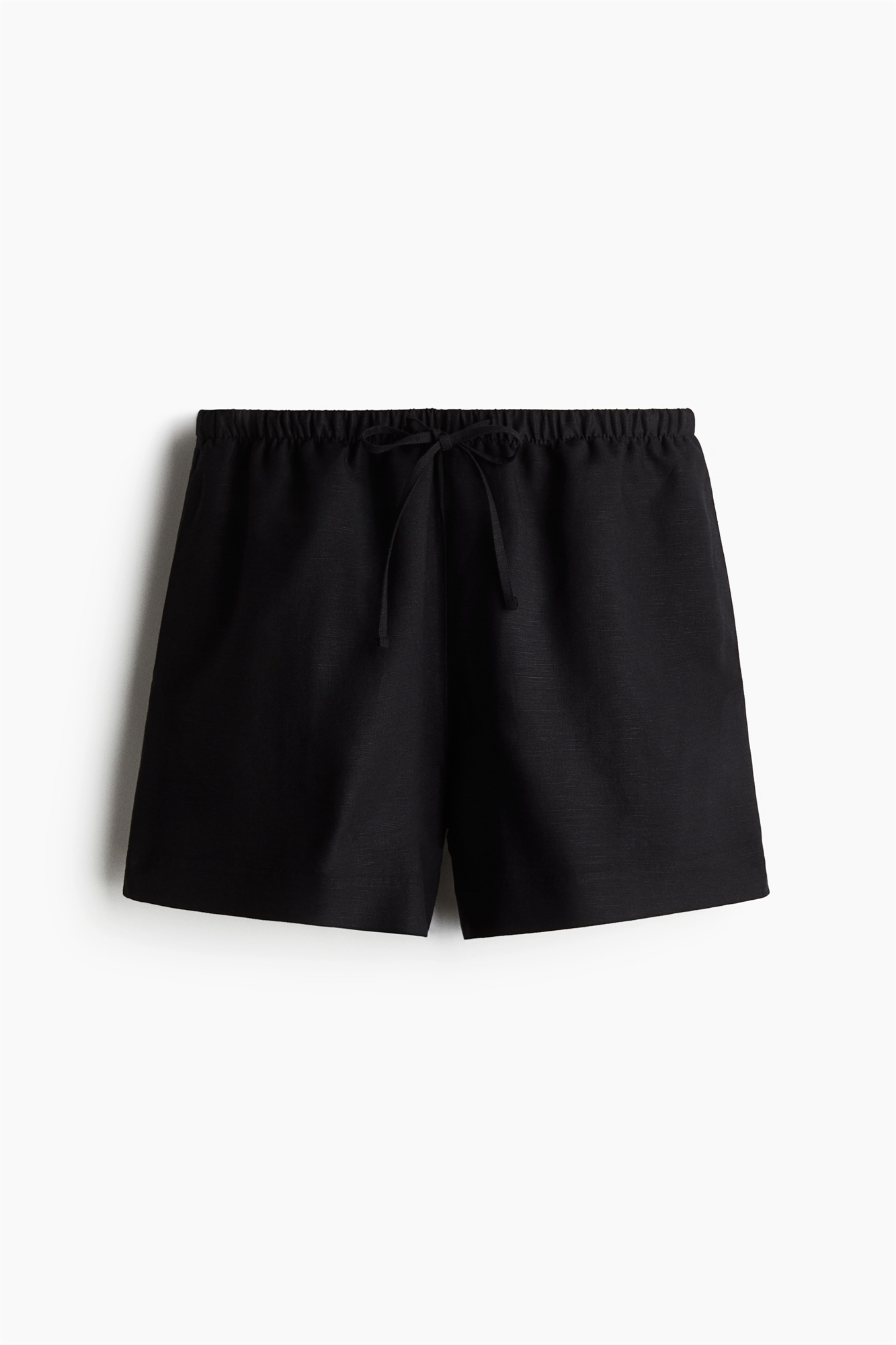 Шорты свободного кроя из льна и вискозы с эластичным поясом на завязках, неброскими боковыми карманами и небольшим разрезом на подоле.