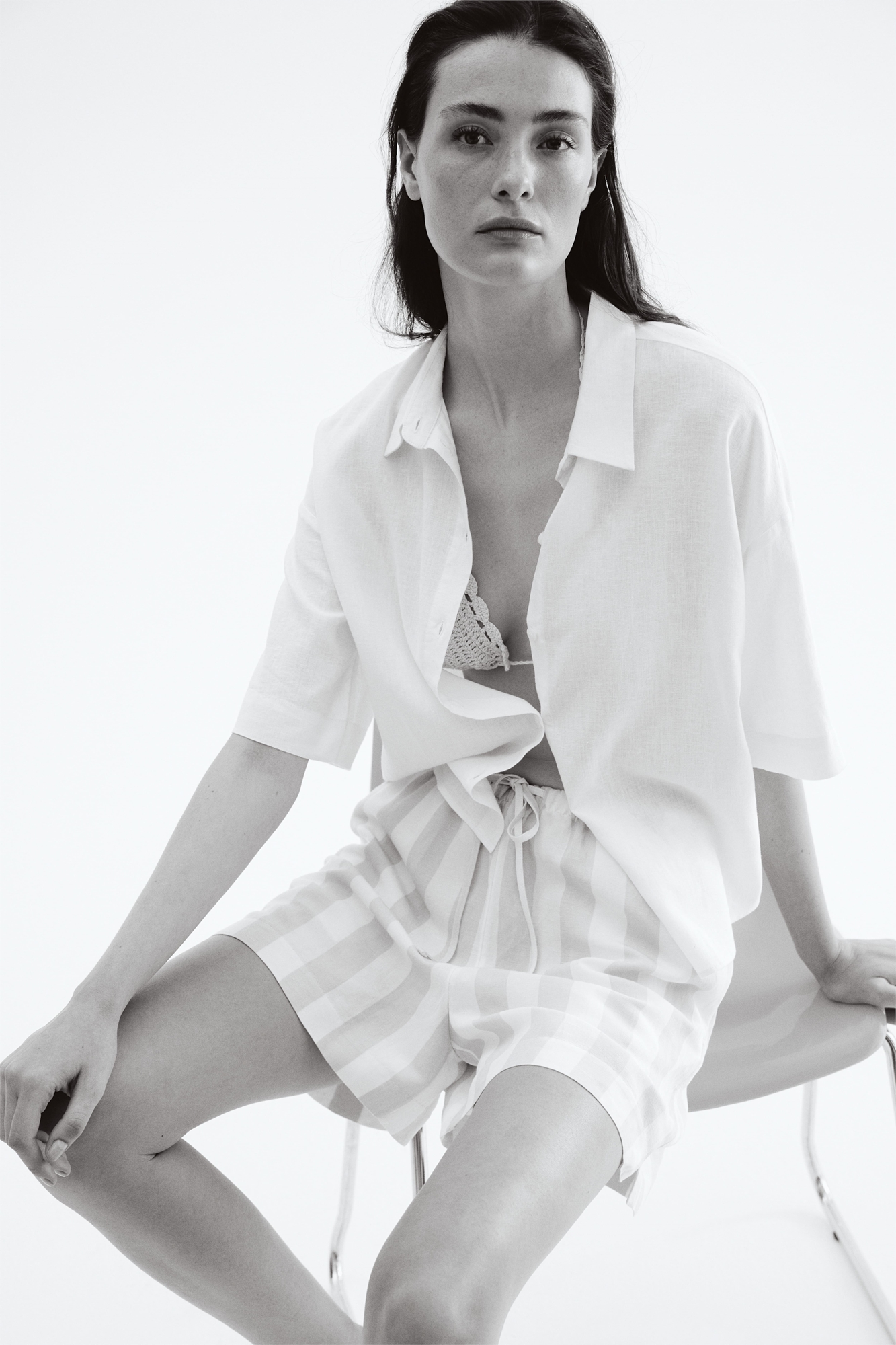 Шорты свободного кроя из льна и вискозы с эластичным поясом на завязках, неброскими боковыми карманами и небольшим разрезом на подоле.