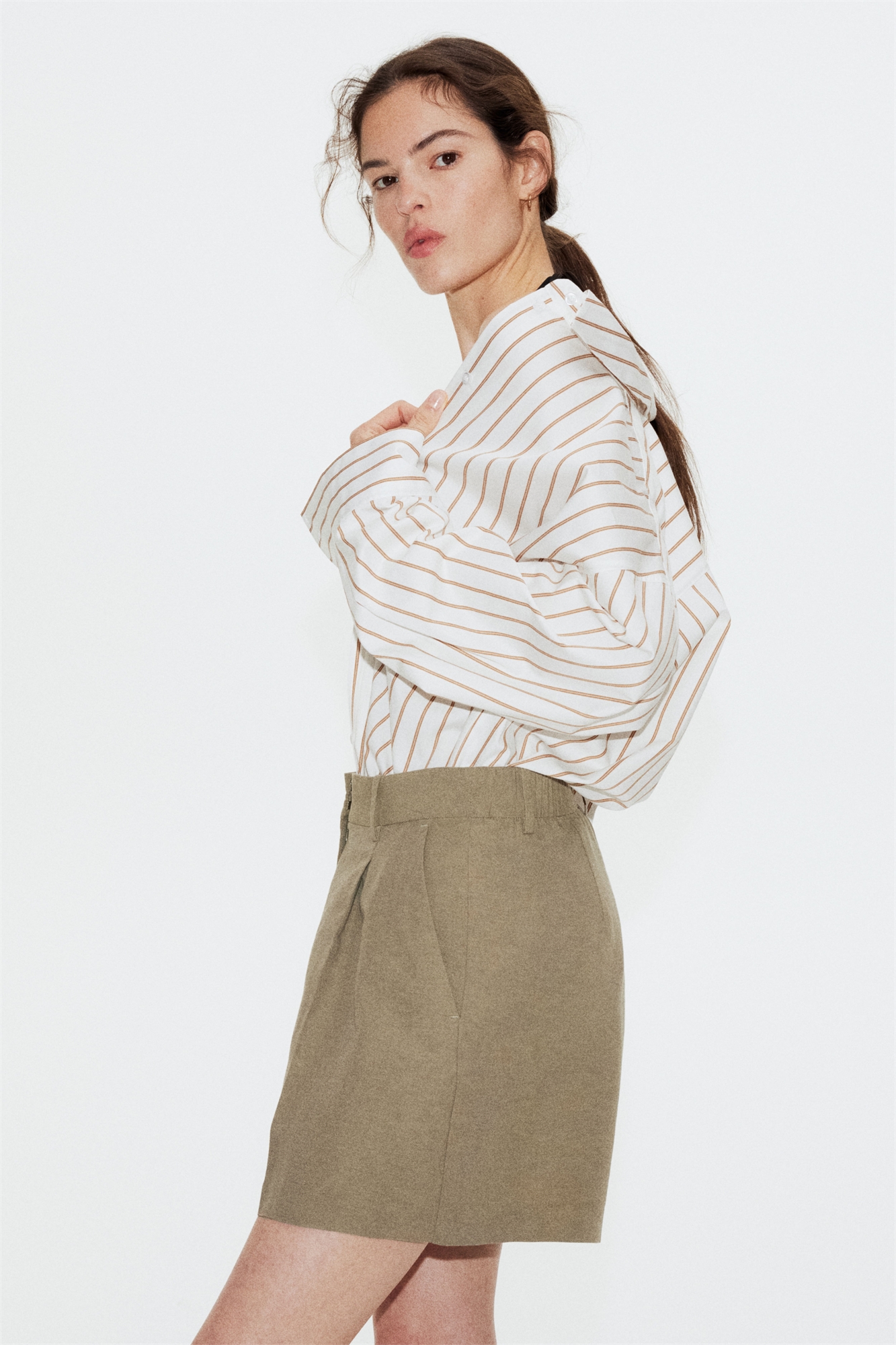 Приталенные шорты свободного кроя с воздушным плетением из смеси льна. Высокая талия с утяжкой сзади и ширинка на молнии с потайной застежкой на пуговицу и крючок. Диагональные боковые карманы, складки спереди и складки спереди и сзади.