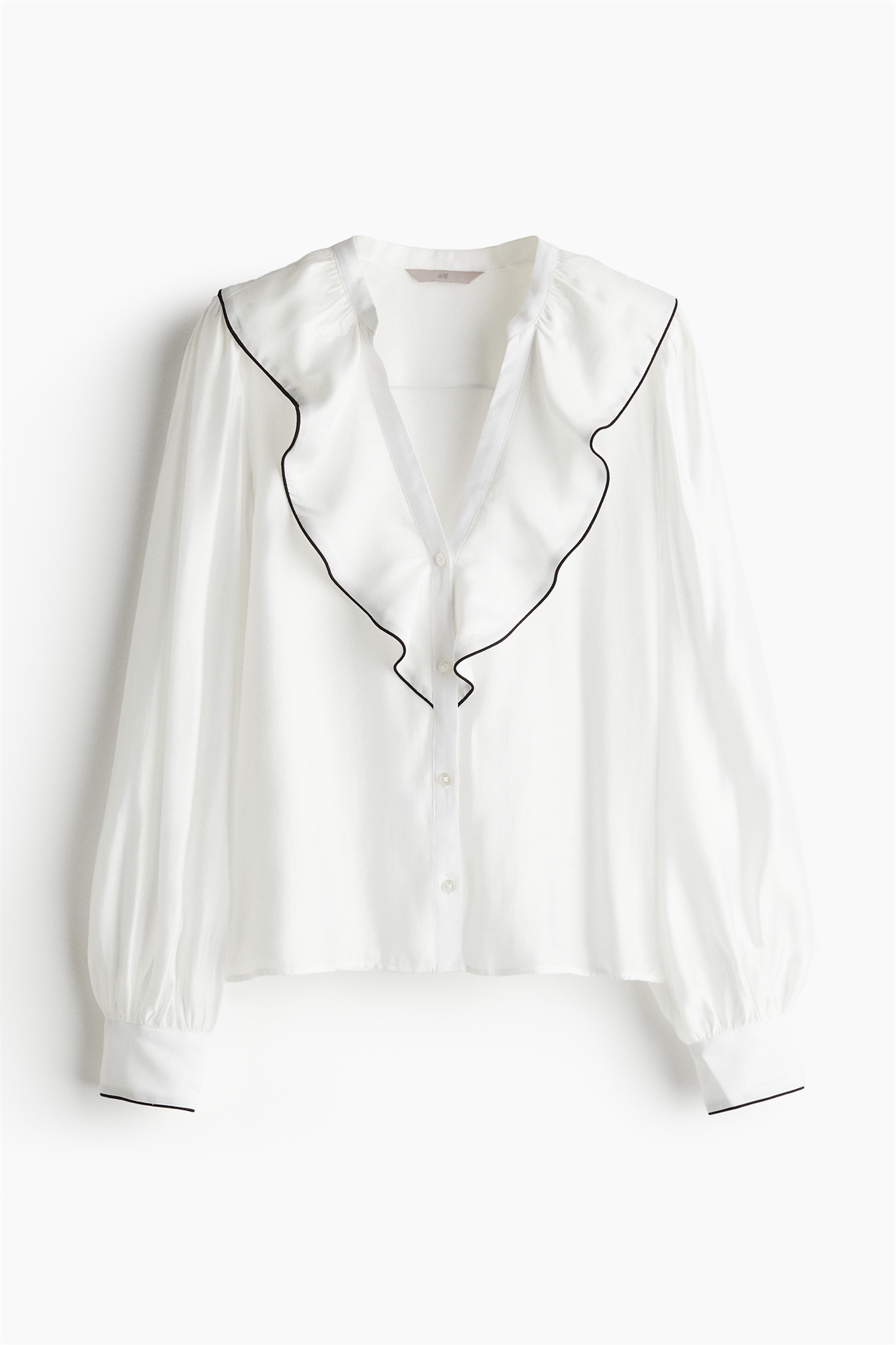 Блузка из полотняного переплетения с глубоким V-образным вырезом и широким воланом, продолжающимся на шее сзади. Застежка на пуговицы спереди и длинные рукава-баллон с манжетами на пуговицах.