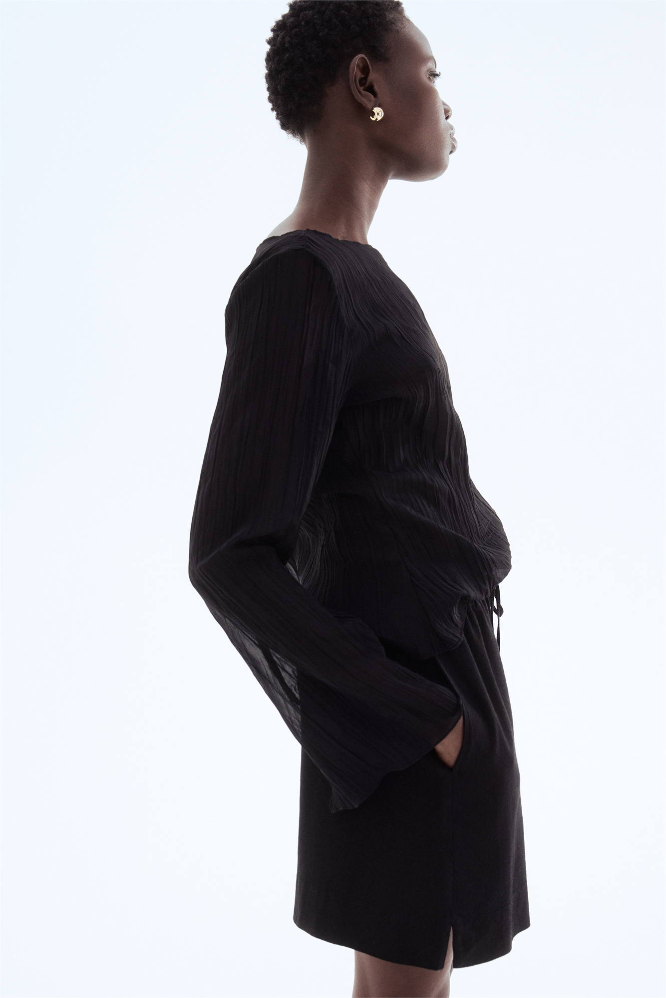 Свободные шорты из воздушного льна и вискозы. Высокая талия с небольшой оборкой, эластичная отделка и узкий шнурок с металлическими бусинами. Незаметные боковые карманы.