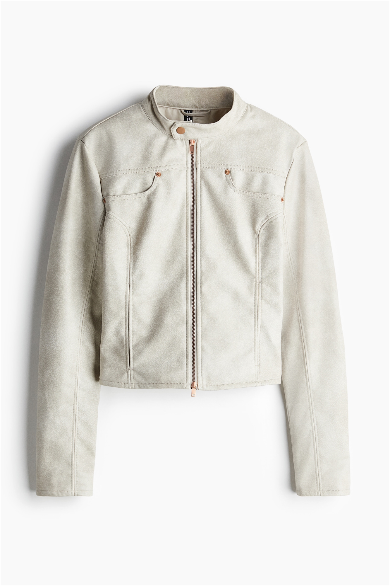 Короткая приталенная куртка из ткани с покрытием и видимыми швами спереди и сзади. Воротник-стойка с удлиненной планкой с прижимной планкой и двусторонняя застежка-молния спереди. Скрытые нагрудные и передние карманы. На подкладке.