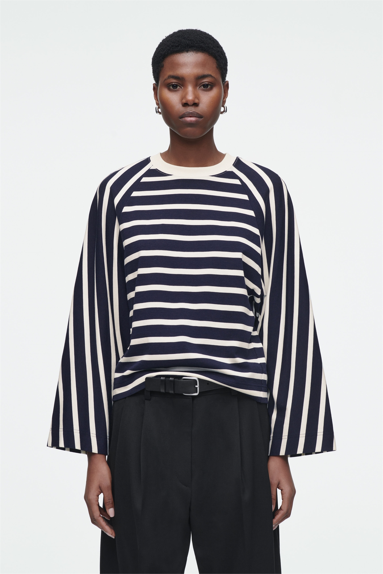 Эта футболка с вырезом горловины подходит для непринужденных выходных. Она сшита из хлопкового трикотажа в непринужденной форме с широкими рукавами "летучая мышь" и слегка обрезанным подолом. Бретонская полоска в темно-синем и белом цветах будет легко сочетаться с джинсами. Расслабленный крой Ткань: 70% хлопок, 30% вискоза. Без учета отделки / Машинная стирка Длина по спинке для размера S составляет 54 см / Модель носит размер S