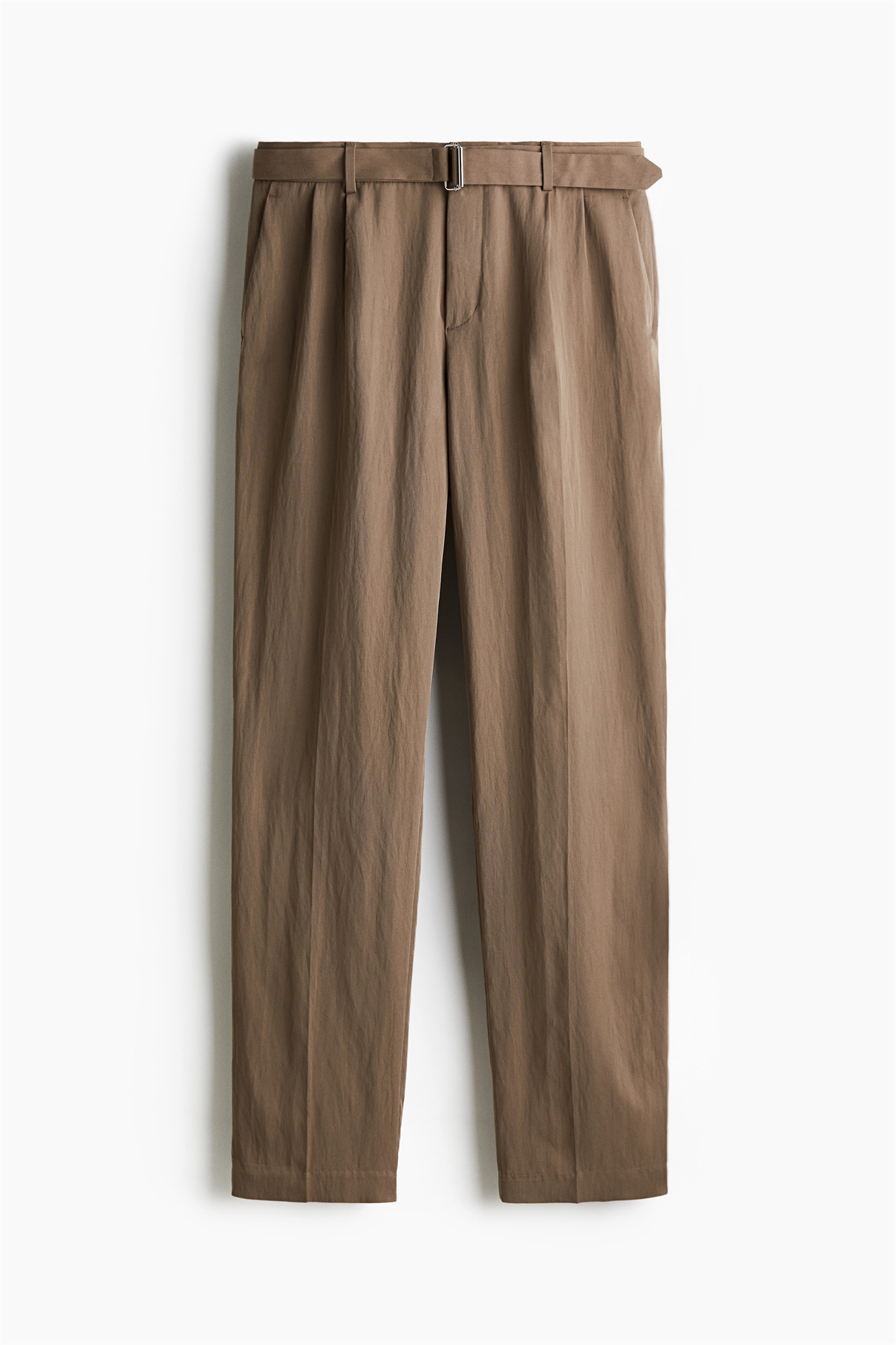 Брюки из саржи со скрытой застежкой на крючок и планку, ширинкой на молнии и пуговицей, а также съемным поясом с металлической пряжкой. Диагональные боковые карманы и втачные задние карманы на пуговице. Штанины со складками спереди и сзади. Регулярный крой для комфортной носки и классического силуэта.