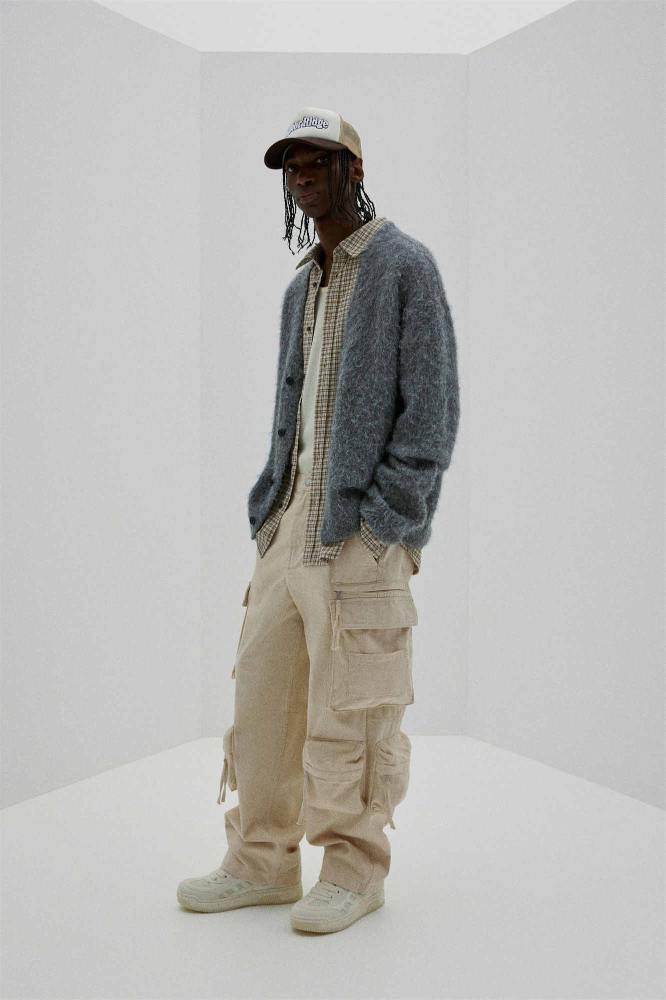 Джинсы карго из жесткого хлопкового денима с диагональными боковыми карманами, задними карманами с клапанами и четырьмя карманами на штанинах с различными рисунками. Закругленная нога и свободный крой от сиденья до подола с большим запасом по всей длине ноги. Заниженная промежность и штанины у лодыжки. Регулярная талия и застежка-молния. Предназначены для повседневной носки.