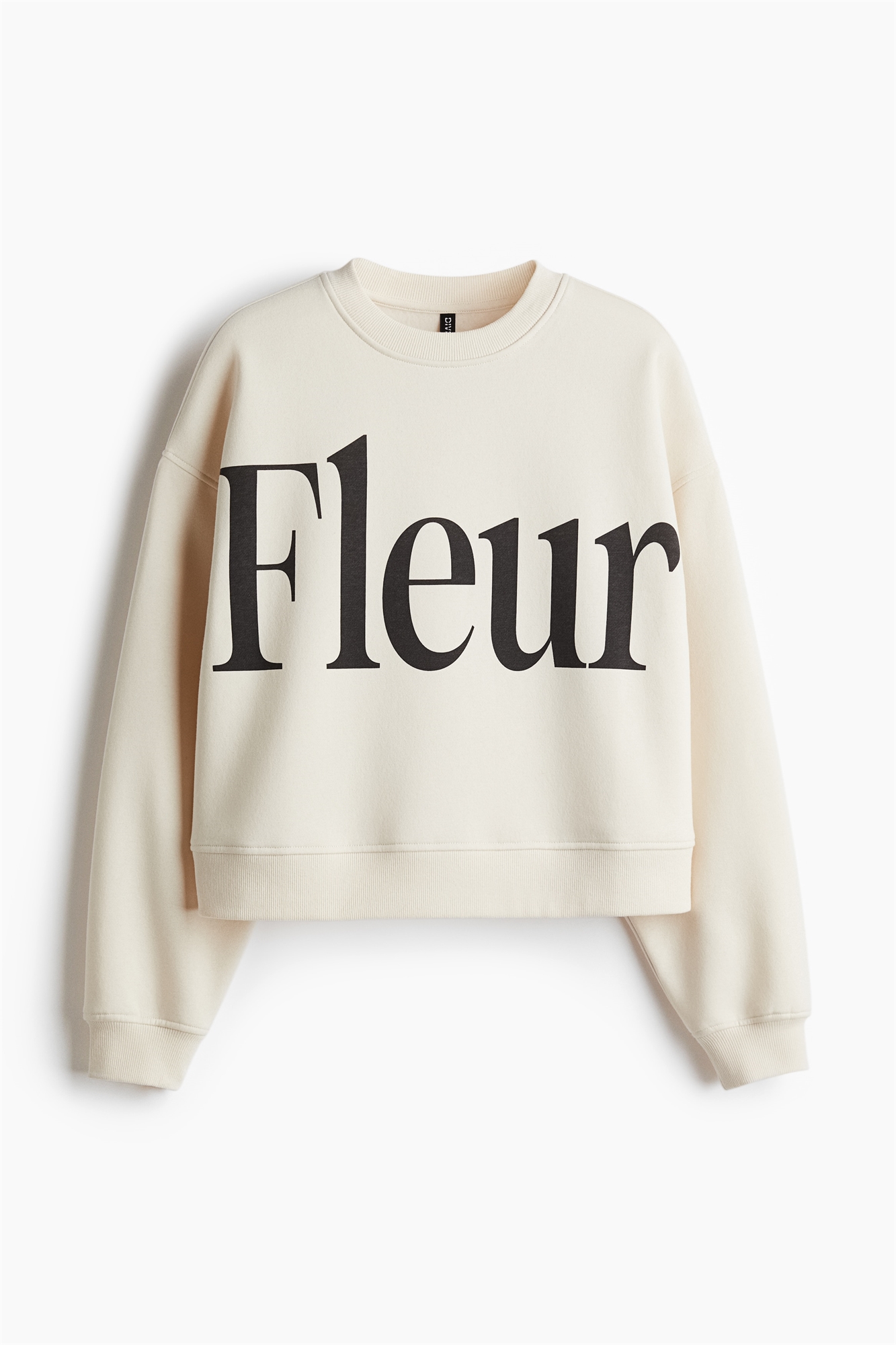 Свободный топ из принтованной толстовки с мягким начесом внутри. Круглый вырез с ребристой отделкой, спущенные плечи и длинные рукава. Ребристые манжеты и подол.