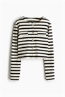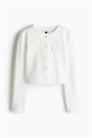 Короткий кардиган из плотного джерси с круглым вырезом, пуговицами спереди и длинными рукавами. Декоративные карманы на груди.