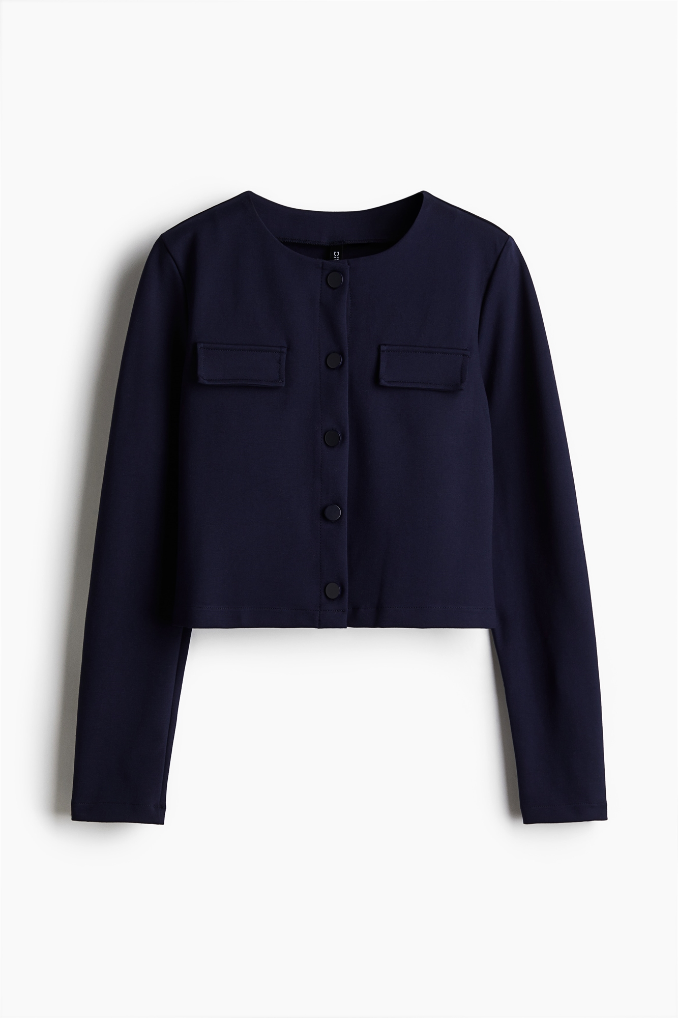 Короткий кардиган из плотного джерси с круглым вырезом, пуговицами спереди и длинными рукавами. Декоративные карманы на груди.