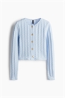 Кардиган из мягкого трикотажа кабельной вязки. Круглый вырез, пуговицы золотистого цвета спереди и длинные рукава.