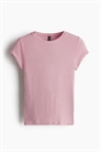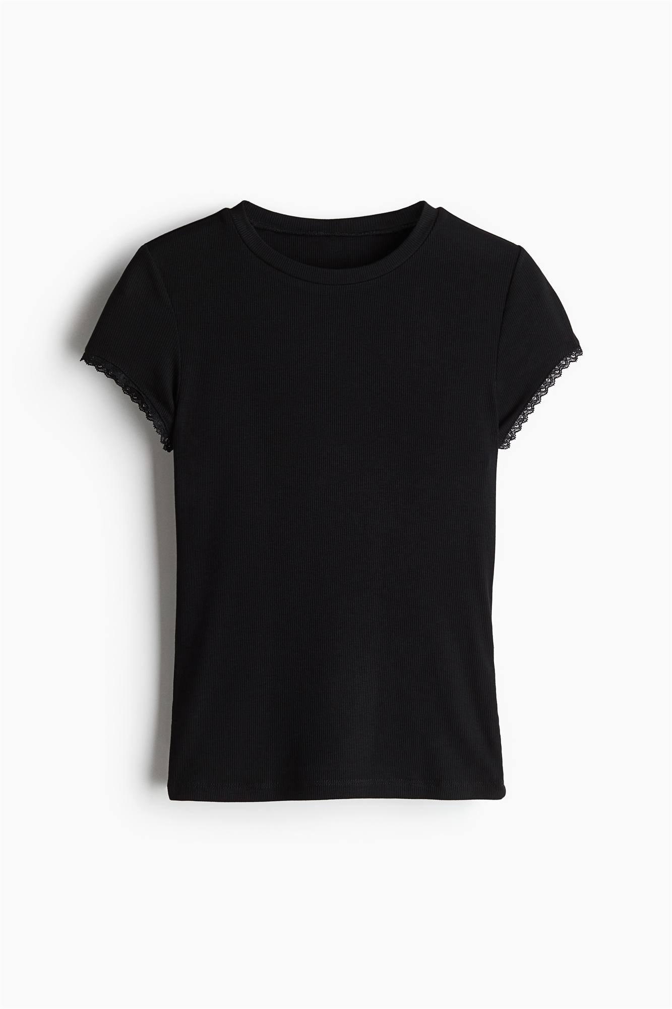 Короткая приталенная футболка из узкого ребристого вискозного джерси с узкой окантовкой по вырезу горловины и нежной кружевной отделкой на манжетах.
