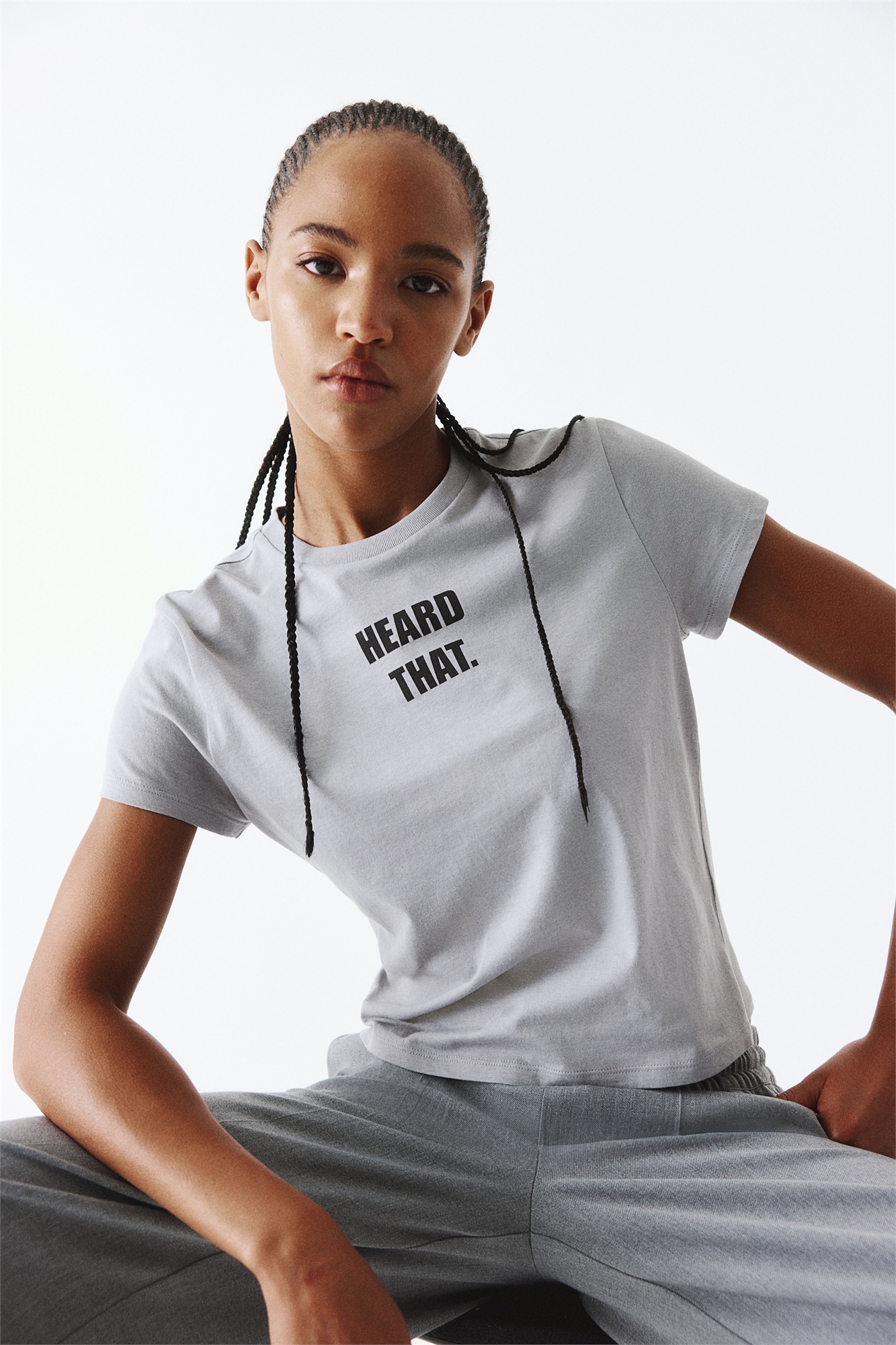 Короткая приталенная футболка из мягкого хлопкового джерси с принтом, ребристая отделка по вырезу горловины и прямой подол.