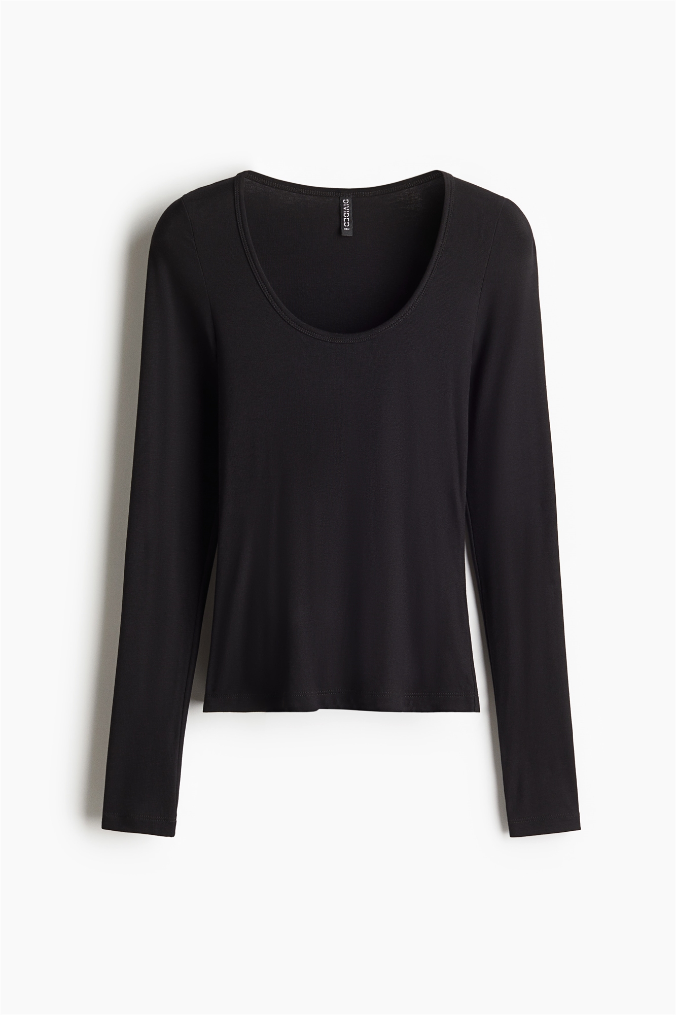 Облегающий топ из узкого ребристого вискозного джерси с глубоким круглым вырезом и узкой окантовкой. Длинные рукава и прямой подол.