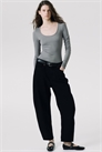 Облегающий топ из узкого ребристого вискозного джерси с глубоким круглым вырезом и узкой окантовкой. Длинные рукава и прямой подол.