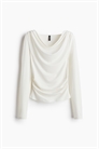 Короткий приталенный топ из эластичного джерси с вырезом-лодочкой, длинными рукавами и сборками по боковым швам для создания эффекта драпировки.