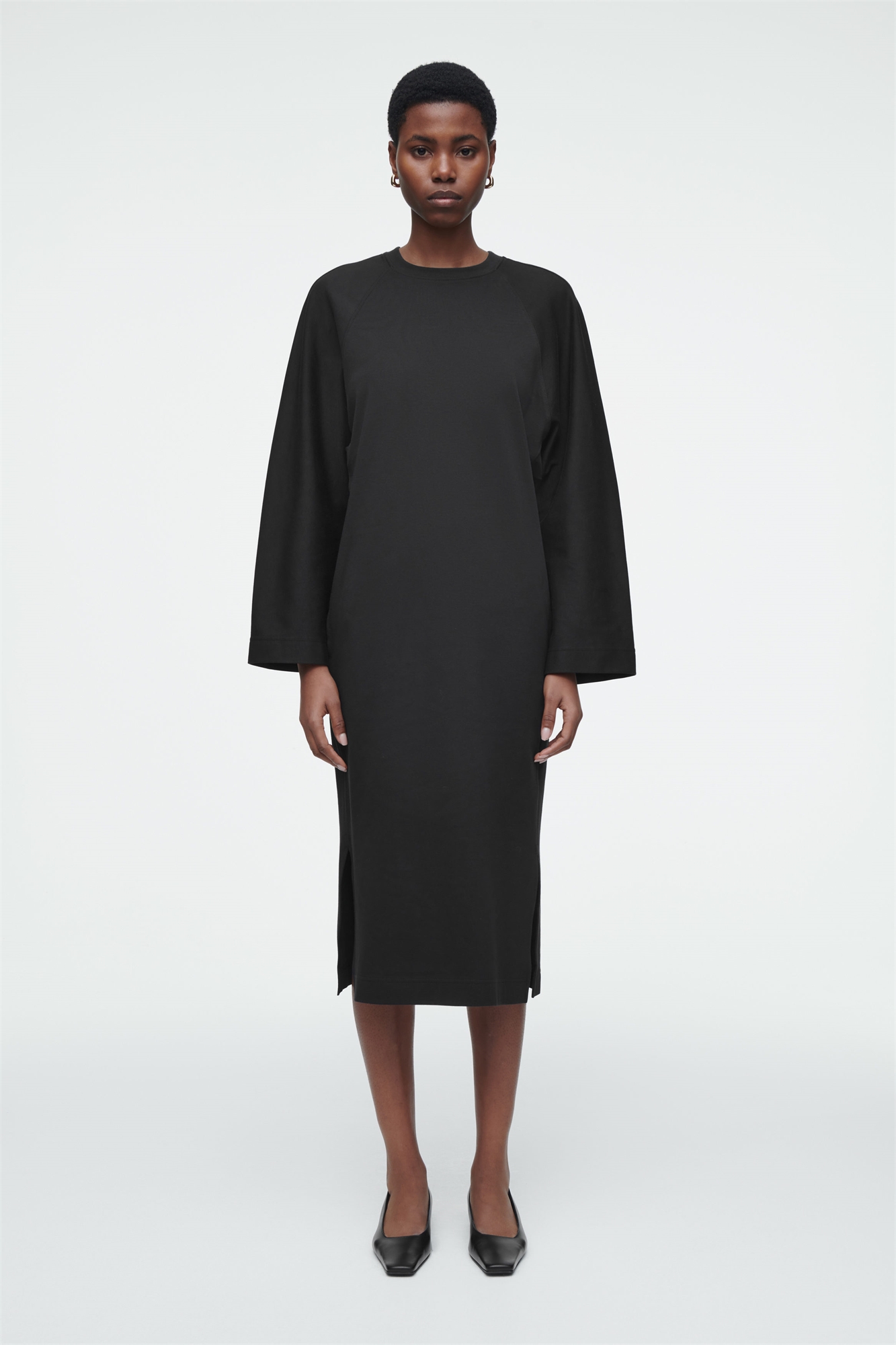Это легкое платье-столбик можно одевать как сверху, так и снизу, в зависимости от аксессуаров. Изготовленное из мягкого хлопка-джерси, оно имеет ребристую горловину, незаметные боковые карманы и длинные рукава "летучая мышь" для придания объема. Носите его с классическими балетками. Регулярная посадка Длина миди, разрез на подоле Ткань: 100% хлопок. Без учета отделки / Машинная стирка Длина по спинке для размера S составляет 112 см / Модель носит размер S