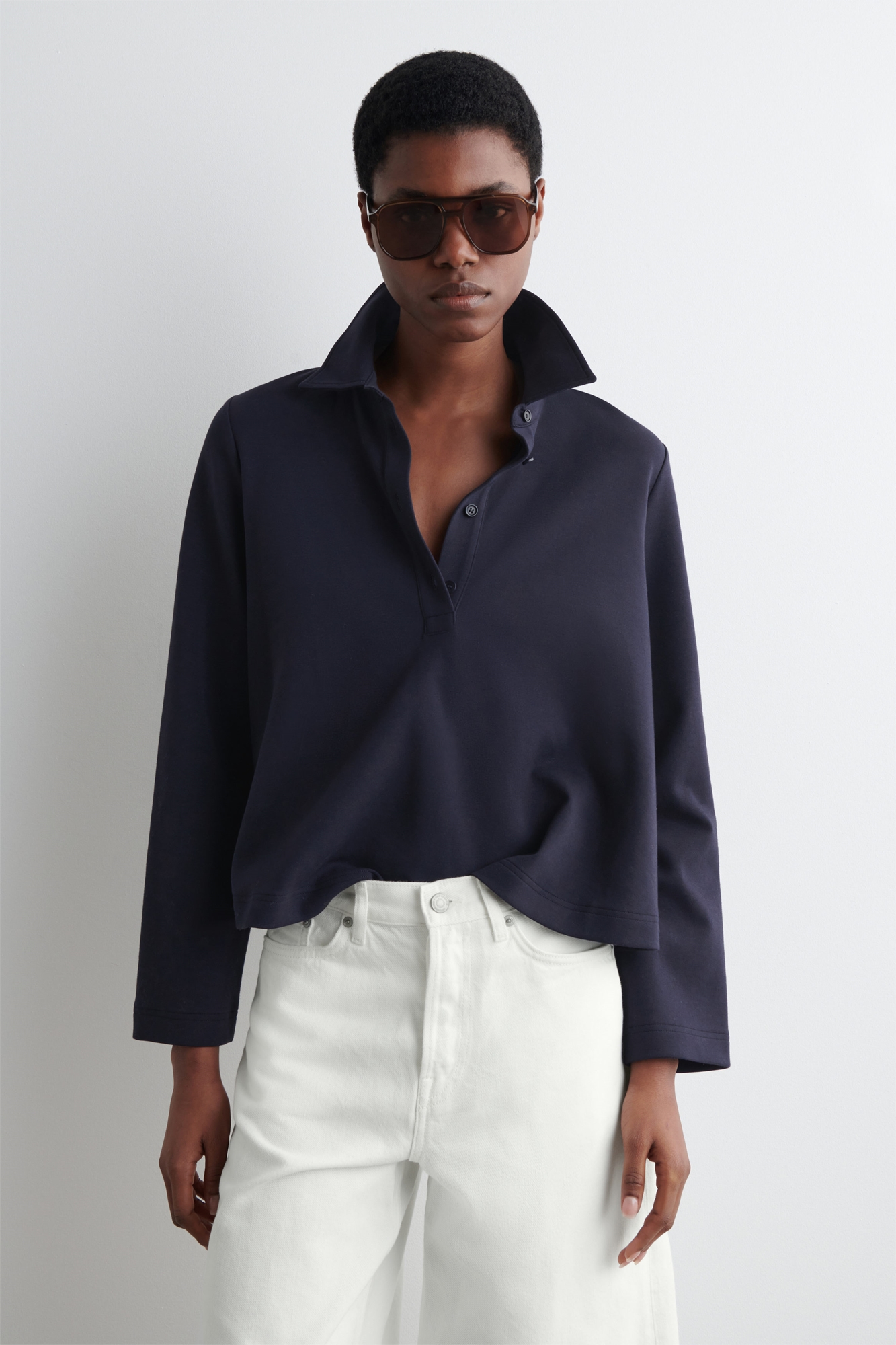 Этот топ с расклешенным подолом и длинными рукавами придает классической рубашке-поло женственность. Он изготовлен из мягкой смеси хлопка в универсальном темно-синем цвете и имеет заостренный воротник и тональные пуговицы. Свободный крой Застежка на пуговицы Лучшая альтернатива обычному полиэстеру, переработанный полиэстер изготавливается из отходов до и после потребления Оболочка: 72% хлопок, 24% переработанный полиэстер, 4% эластан. Без учета отделки / Машинная стирка Длина по спинке для размера S составляет 55,5 см / Модель носит размер S