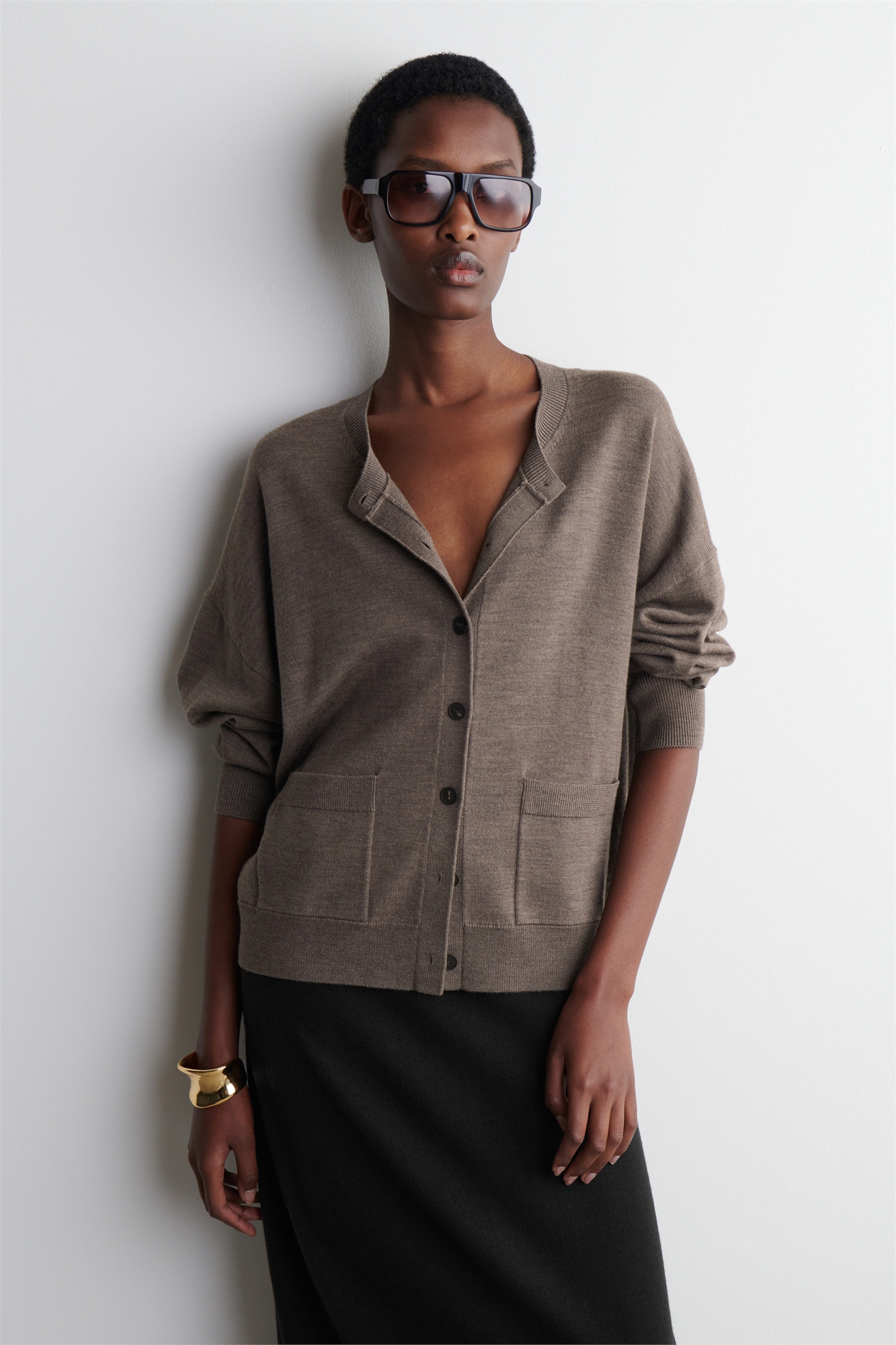 Наши классические трикотажные изделия служат изысканной основой гардероба. Этот кардиган коричневого цвета тонкой вязки из мериносовой шерсти, мягкой и легкой, согреет вас в самые холодные дни года. Он выполнен в непринужденном силуэте, имеет ребристую горловину и пару накладных карманов спереди. Расслабленный крой Застежка на пуговицах В состав этого изделия входит шерстяное волокно Responsible Wool Standard TE-00047206 (RWS), полученное с ферм, сертифицированных в соответствии с требованиями к благополучию животных и управлению земельными ресурсами Шелл: 100% шерсть мериноса. Без учета отделки / Машинная стирка Длина спины размера S составляет 58 см / Модель носит размер S