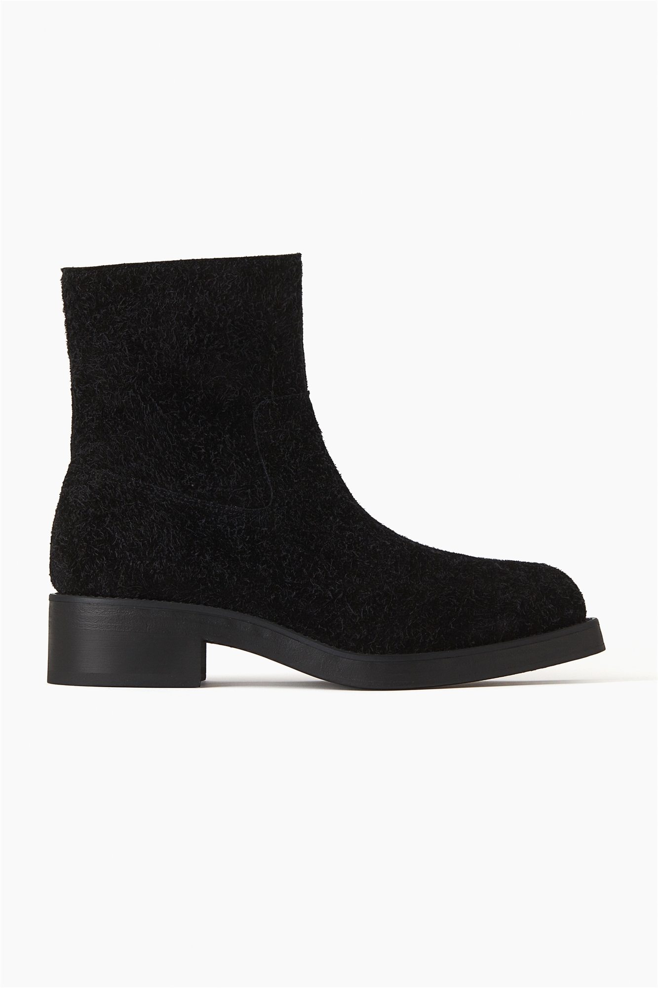 H&M Atelier. Ботинки по щиколотку из матовой замши с миндалевидными носками, застежкой на молнию с одной стороны и блочным каблуком. Кожаные подкладка и стелька. Каблук 4,5 см.