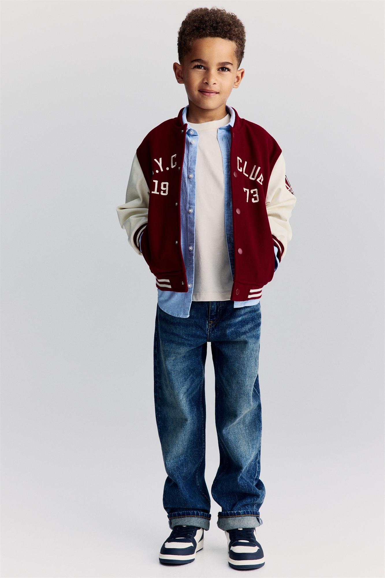 Джинсы с 5 карманами из мягкого, эластичного хлопкового денима. Свободный крой по бедрам, ляжкам и штанинам. Регулируемый, эластичный пояс и ширинка на молнии с пуговицей.