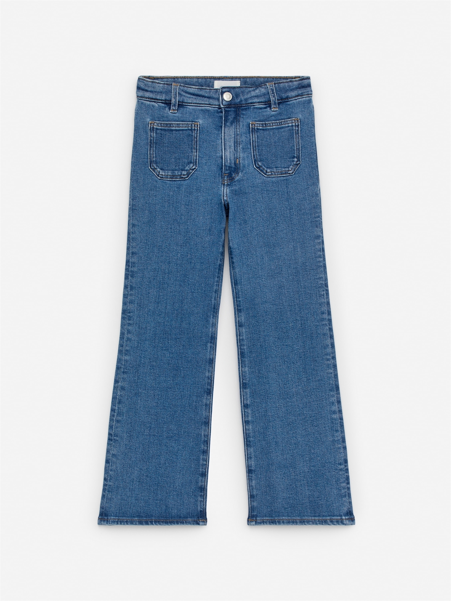 Расклешенные джинсы из хлопка с добавлением эластана. Регулируемая резинка на поясе. Накладные карманы спереди и сзади. Застежка на молнию.