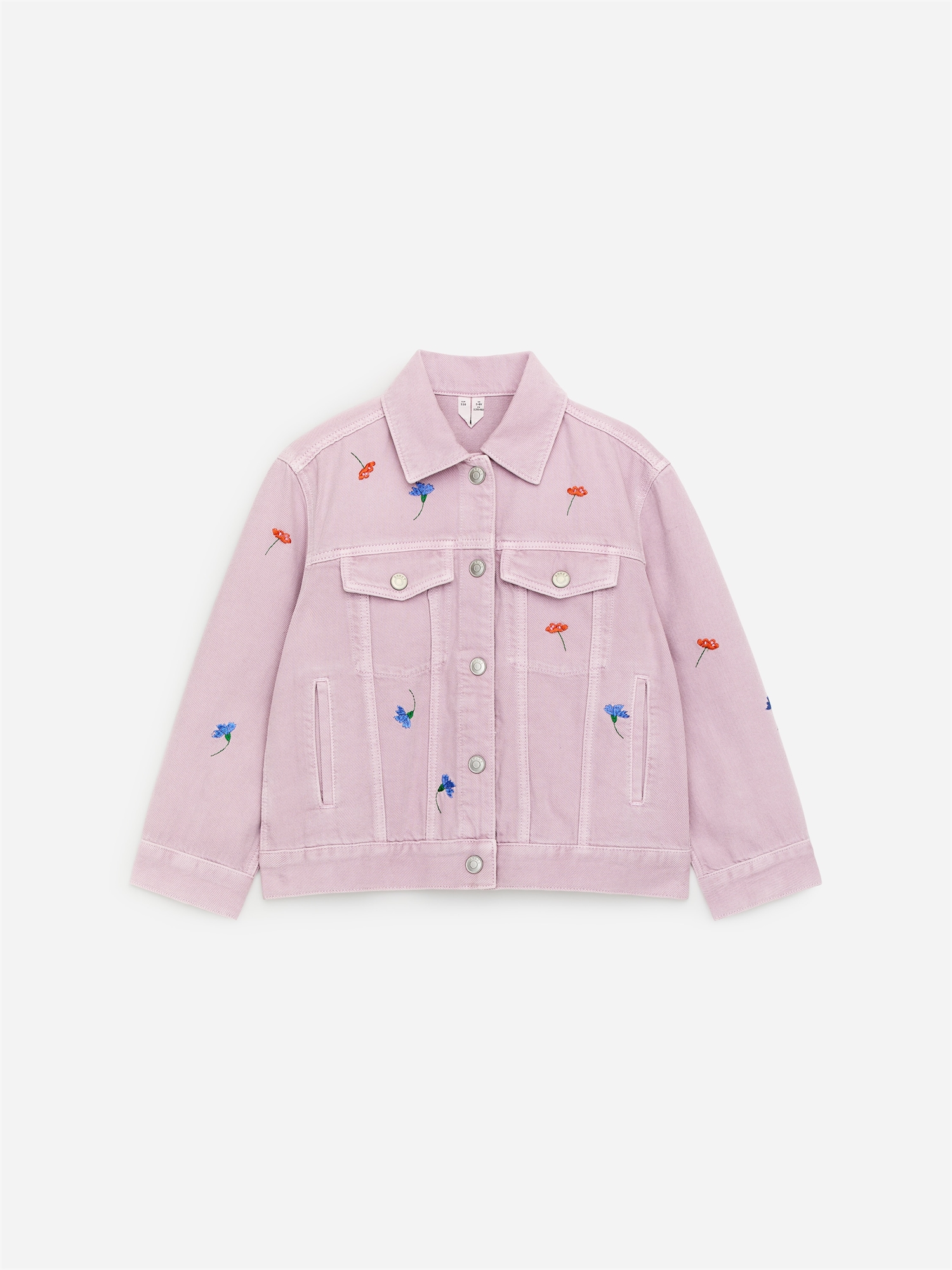 Классическая джинсовая куртка с вышивкой, накладными карманами на груди и низкими прорезными карманами.