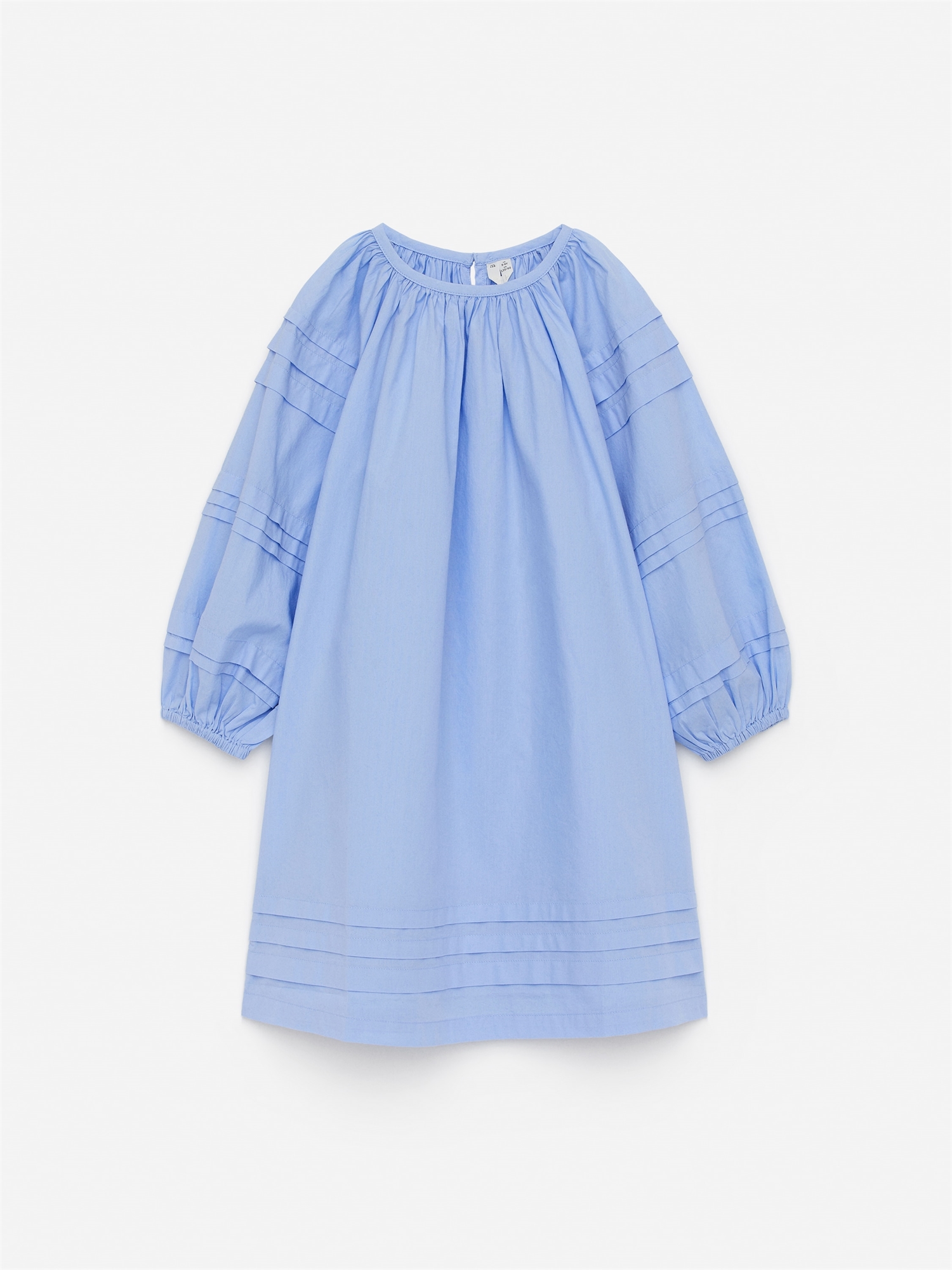 Платье из поплина с деталями в виде подтяжек на длинных рукавах и по подолу. Закругленный вырез со сборками и отверстие для ключа с застежкой на пуговицу и петлю сзади. Эластик и сборки на концах рукавов. Без подкладки.