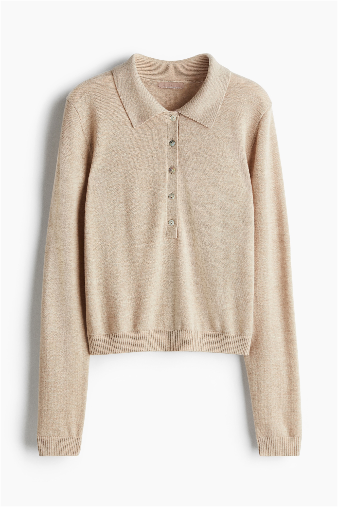 Рубашка-поло из мягкого тонкого трикотажа, выполненного из смеси кашемира и шерсти. Воротник и застежка на пуговицы с перламутровыми пуговицами, длинные рукава, манжеты и подол в рубчик.