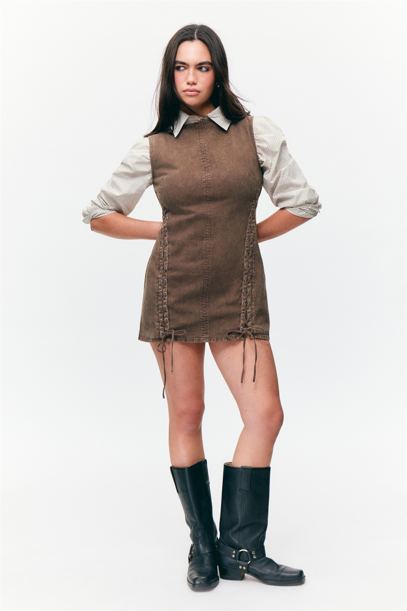 Короткое кружевное платье без рукавов, облегающее фигуру. Круглый вырез, боковая шнуровка и застежка-молния сзади. Облегающий крой. Короткая длина. Круглый вырез. Кружевная отделка. Застежка-молния сзади.