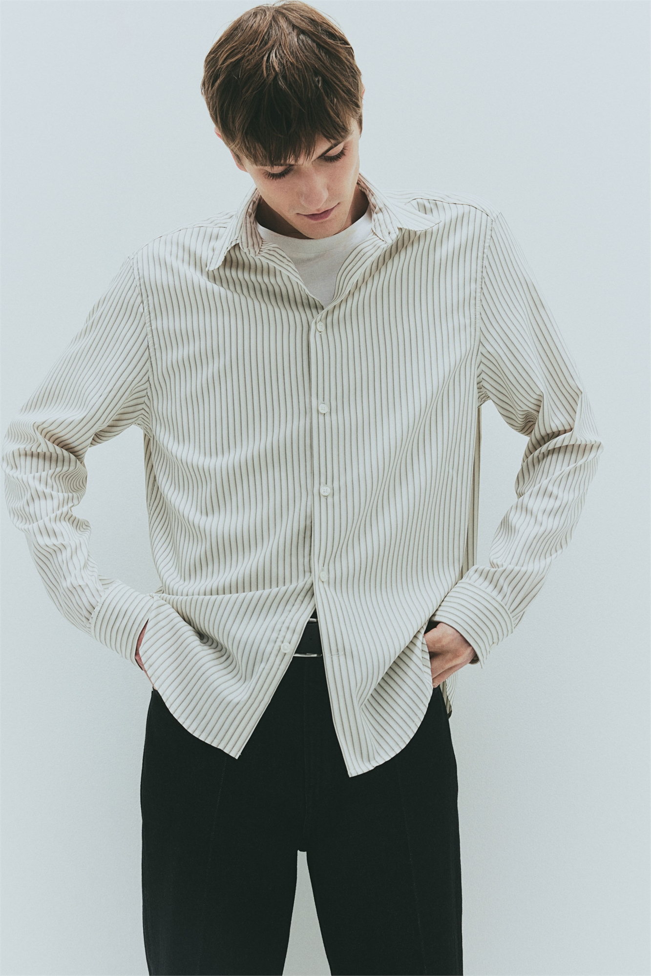 Рубашка из мягкого полотна с отложным воротником, французским передом, передом с короткими складками сзади и длинными рукавами с манжетами на пуговицах. Аккуратный закругленный подол. Регулярный крой для комфортной носки и классического силуэта.