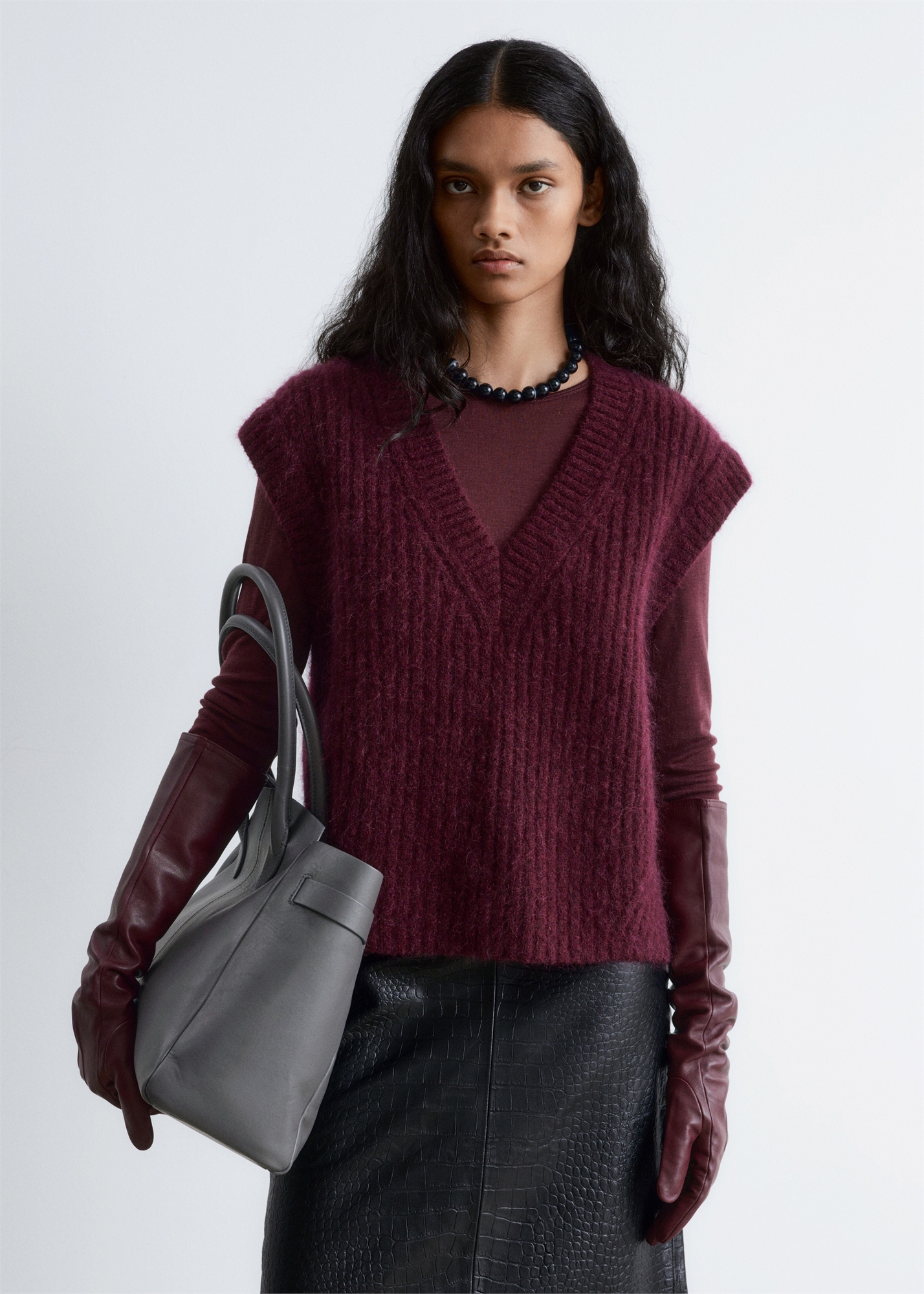 Жилет с V-образным вырезом, вязаный из смеси шерсти и мохера, с отделкой в рубчик и боковыми разрезами на подоле. • Свободный крой • 39% шерсти RWS TE-00047206 • 30% мохера RMS TE-00047206 Длина жилета: 57 см / 22,4" (размер S)