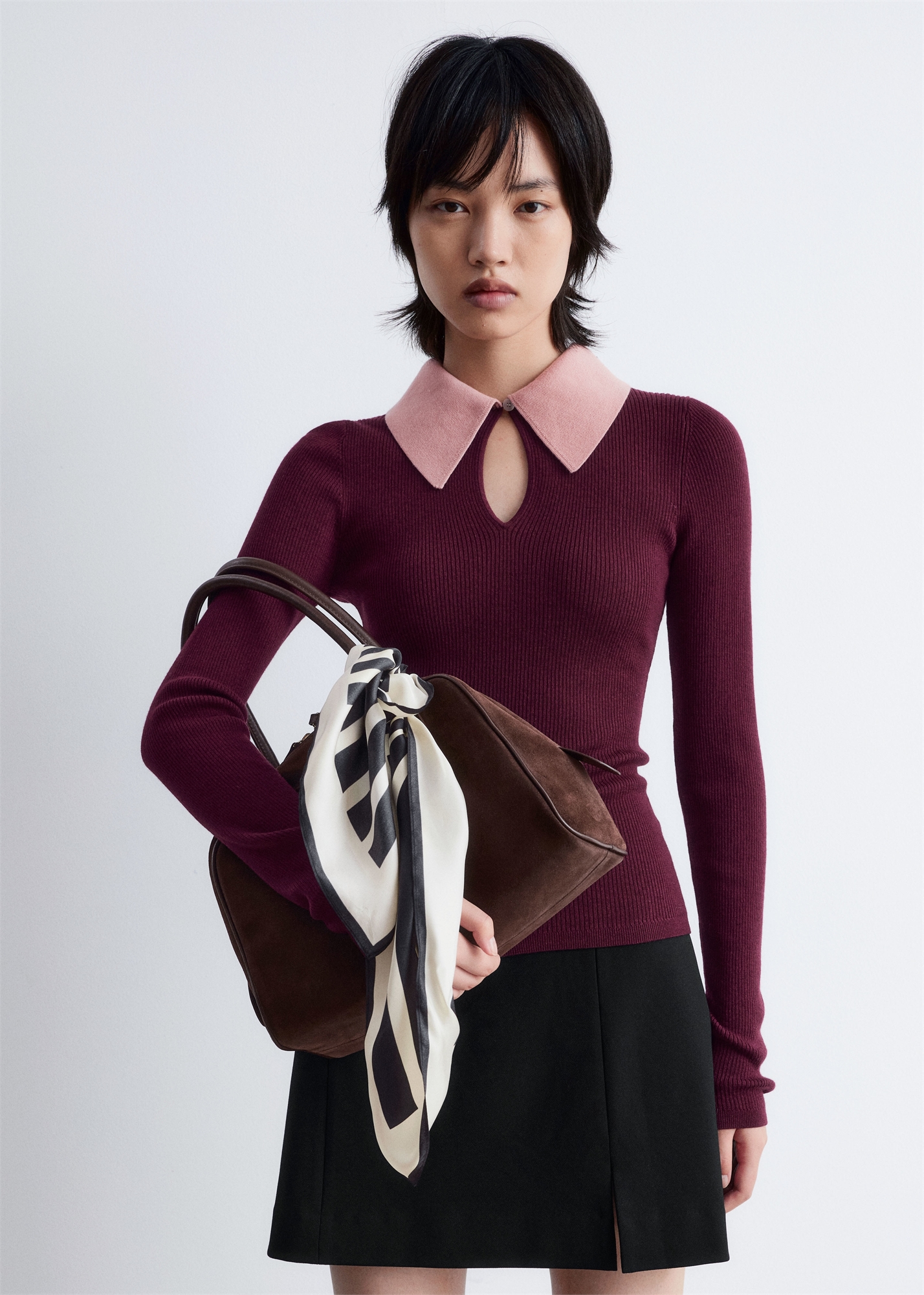 Топ с длинными рукавами, вязаный из шерстяной смеси. С классическим воротником и вырезом-ключницей, застегивающимся на жемчужную пуговицу. • 55% шерсти RWS TE-00047206 Длина топа: 58 см / 22,8" (размер S)