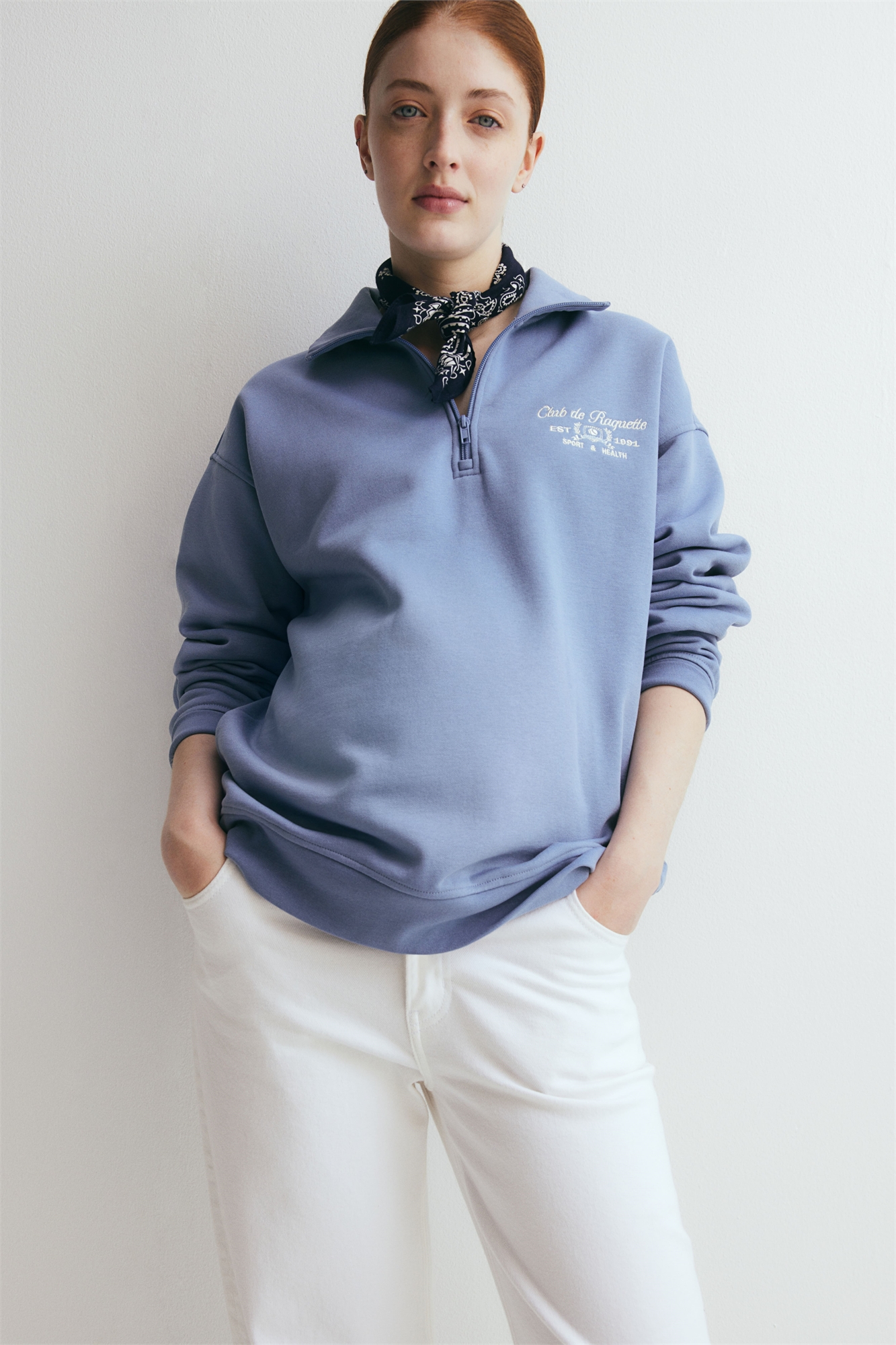 Свободный топ из толстовочной ткани с мягкой начесом внутри и вышитым текстовым мотивом на груди. Двухслойный воротник-стойка и застежка-молния в верхней части, спущенные плечи и длинные рукава. Ребристые манжеты и подол.